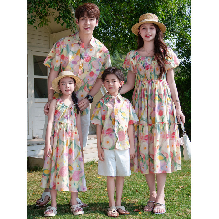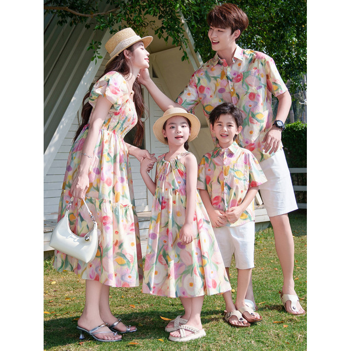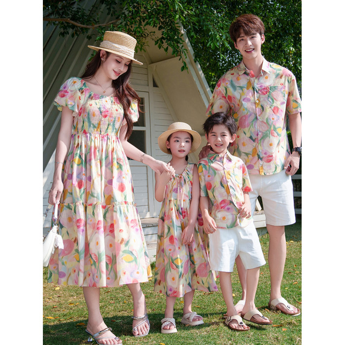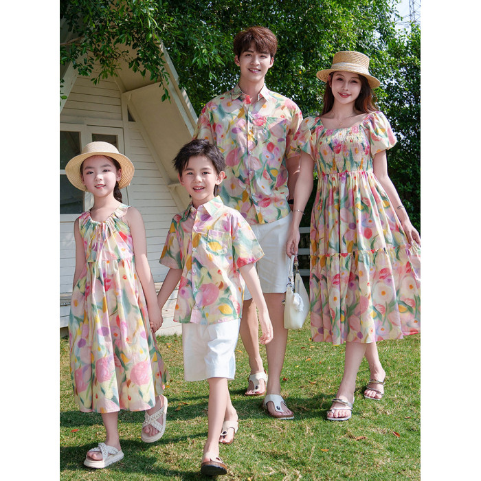 親子裝一家三口沙灘裝海邊度假風夏季四口襯衫套裝連衣裙母女裙子