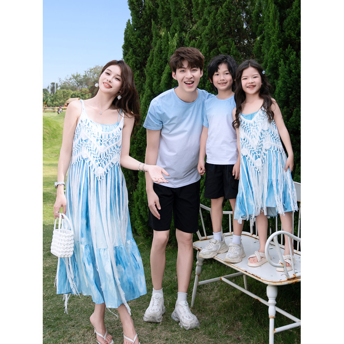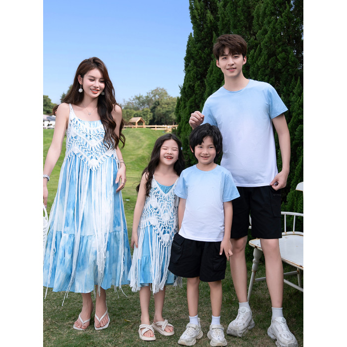 親子裝一家四口2025新款三口短袖T恤套裝海邊度假家庭母女連衣裙