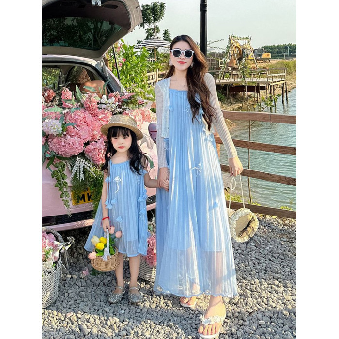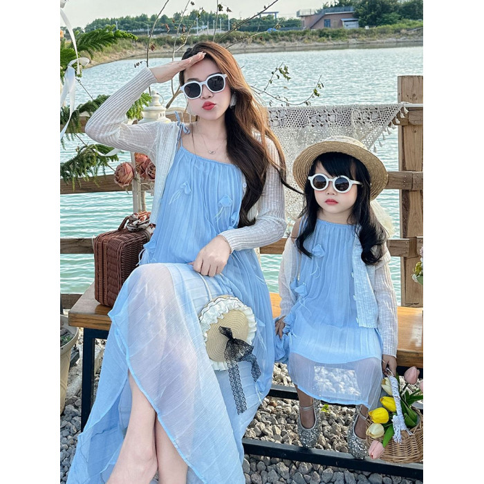 海邊度假親子裝母女裝夏季海南三亞沙灘適合旅遊拍照的藍色連衣裙