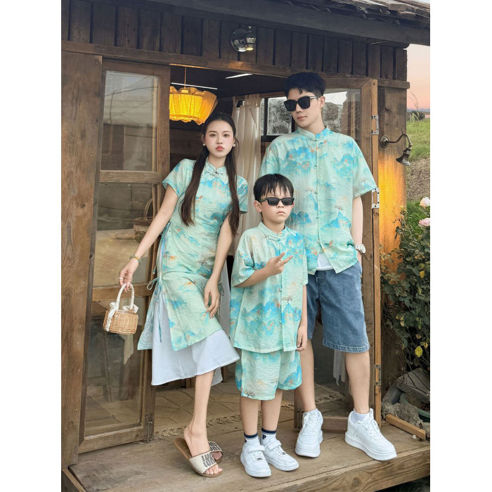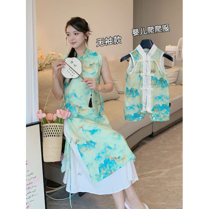 嬰兒親子裝夏季漢服短袖套裝一家三口2025復古國風母女旗袍連衣裙