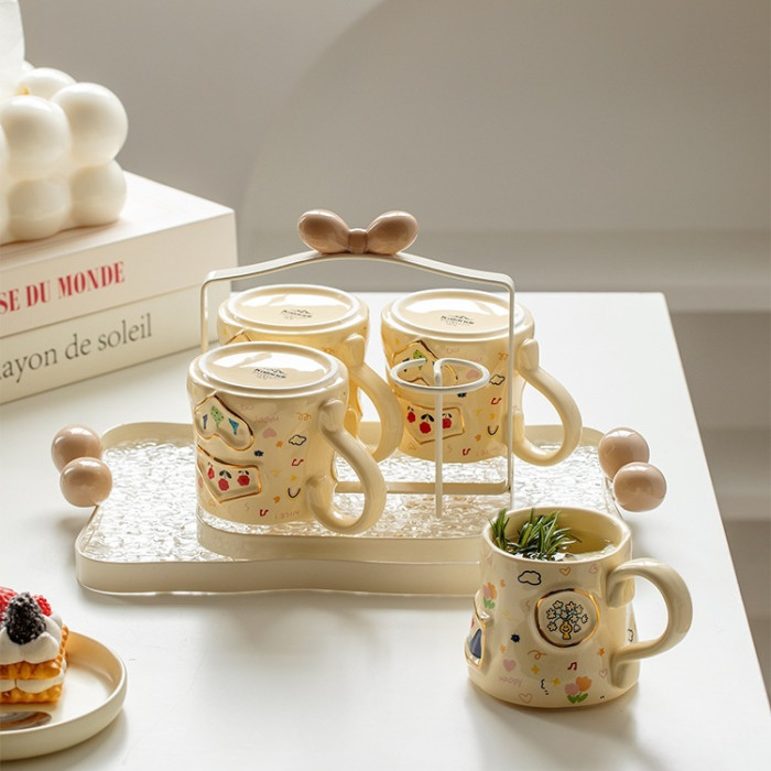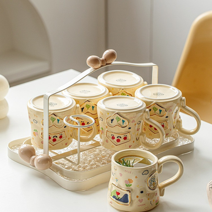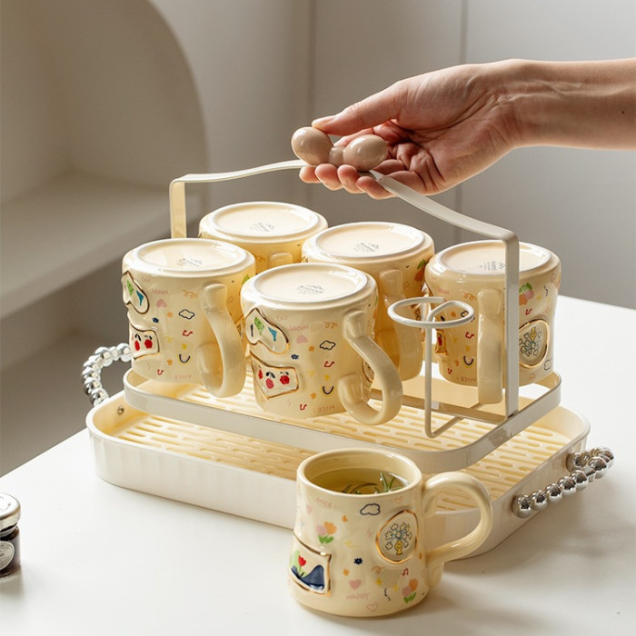 嬭黃漫框水盃套裝【6盃+1個嬭黃瀝水塑料托磐+1個嬭白盃架(嬭咖蝴蝶結)】