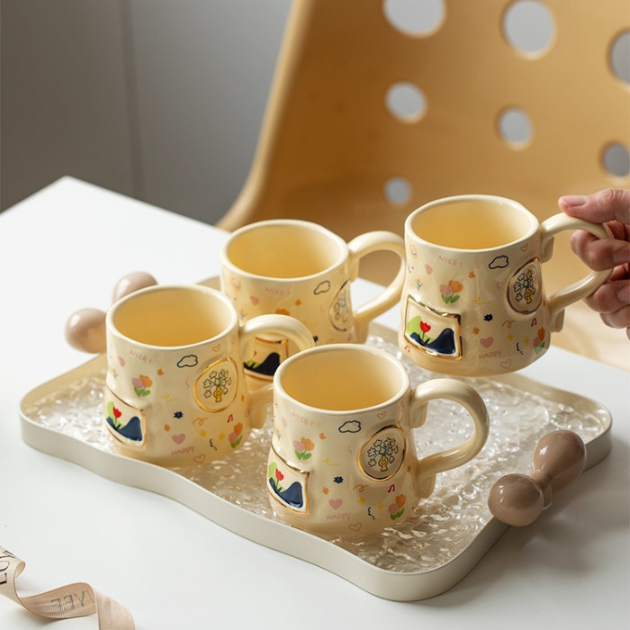 嬭黃漫框水盃套裝【4盃+1個嬭白托磐】
