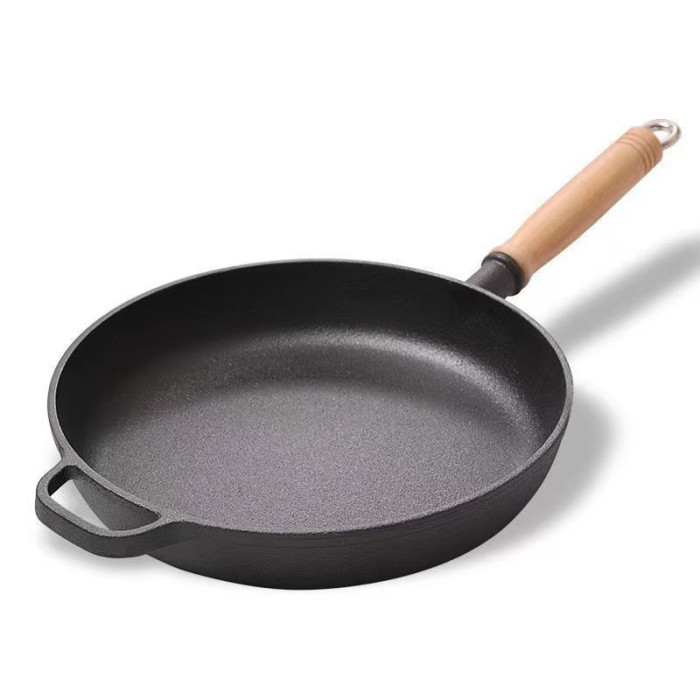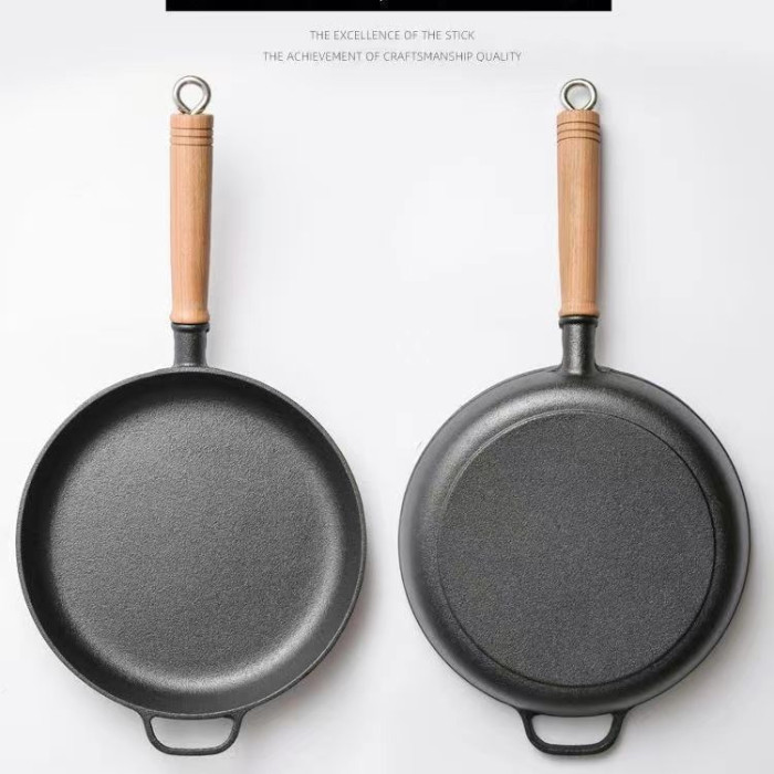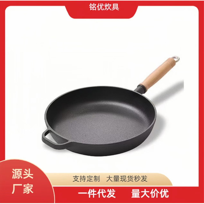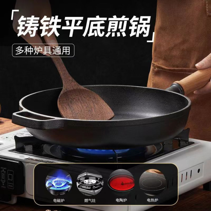 鑄鐵平底鍋不沾煎鍋生鐵煎盤早餐鍋煎蛋鍋牛排鍋家用手抓餅鍋木柄
