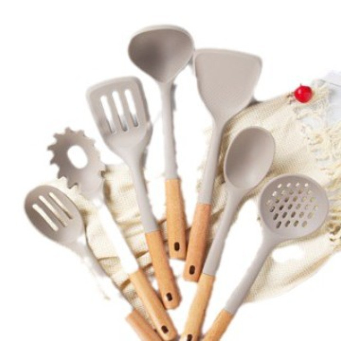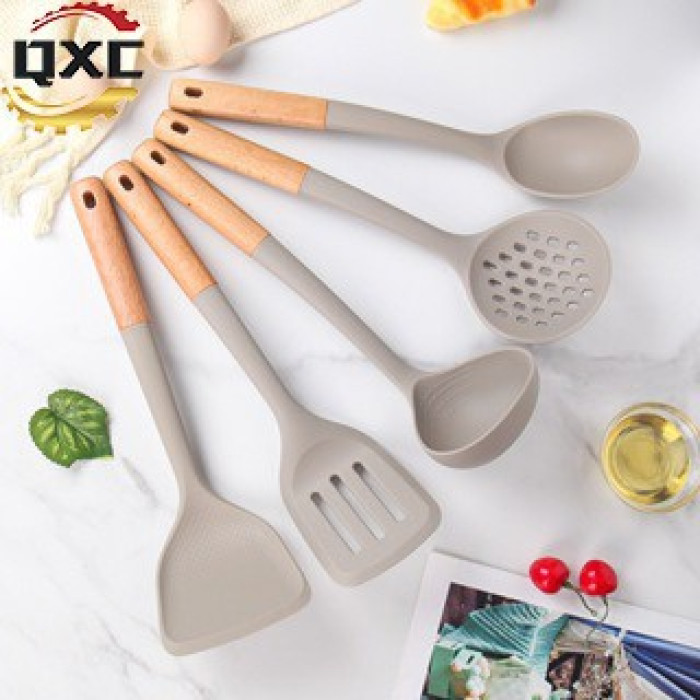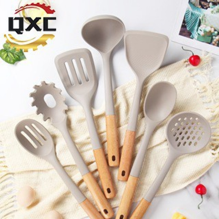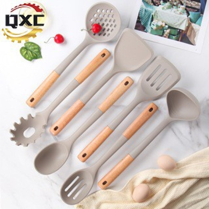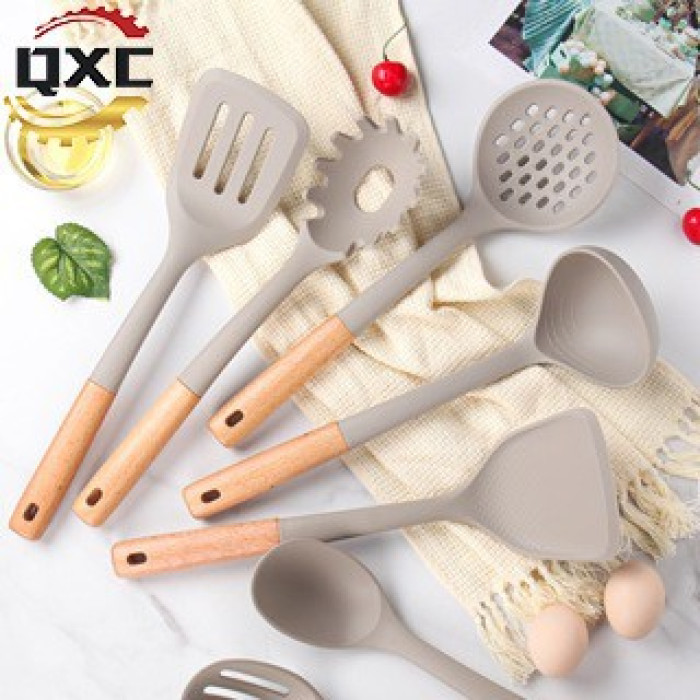 防燙耐高溫木柄矽膠廚具7件套家用廚房烹飪鏟勺套裝