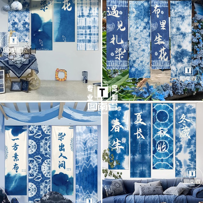 民族紥染風條幅掛布幼兒園環創背景布藍色染花氛圍感裝飾布
