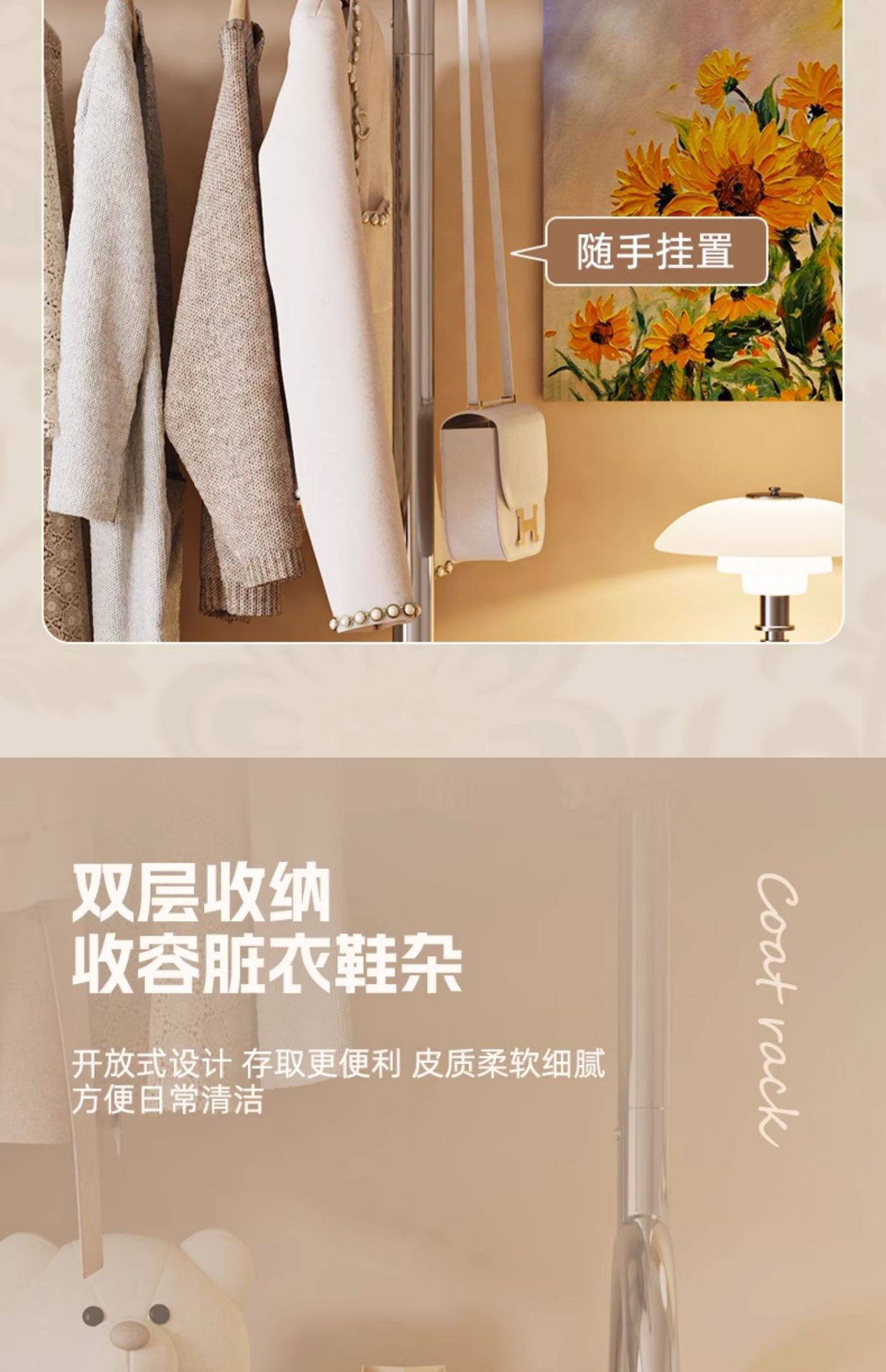 【102cm嬭油白】雙層置物+圓潤掛鉤設計+萬向輪