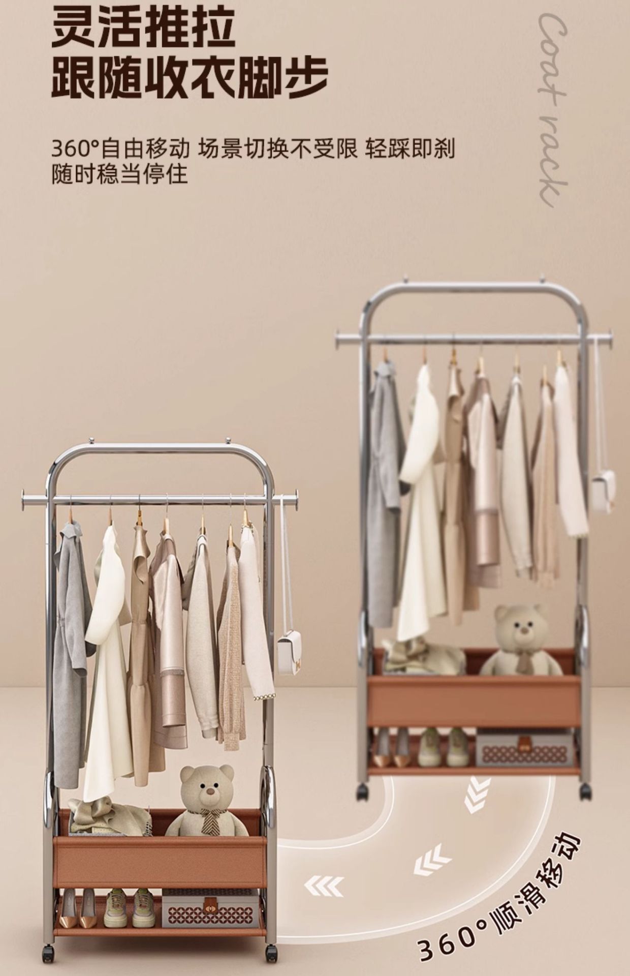 【102cm陶瓷棕】雙層置物+圓潤掛鉤設計+萬向輪