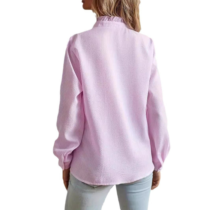 女性條紋褶皺細節長袖單排釦優雅知性外出約會工作襯衫上