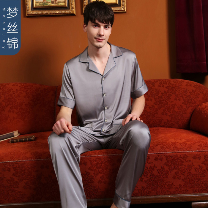 情侶睡衣女春秋冰絲兩件套裝仿真絲綢薄款短袖長褲男士大碼家居服