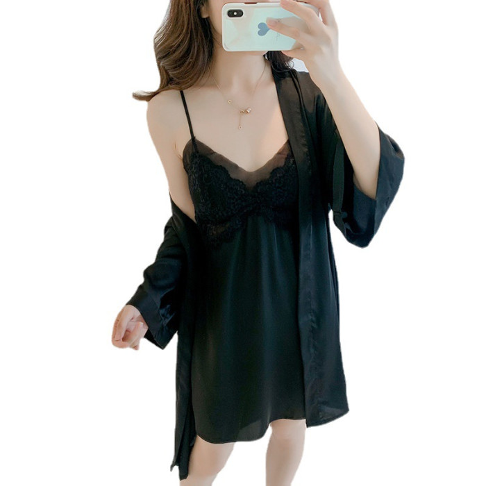 新款睡衣女夏冰絲綢兩件套帶胸墊吊帶睡裙睡袍浴袍蕾絲結婚新娘袍