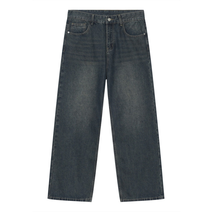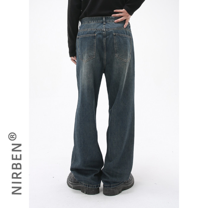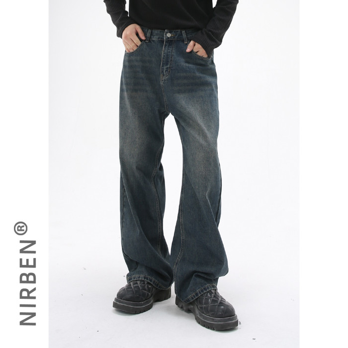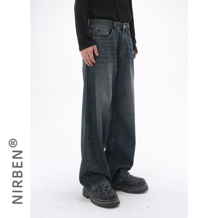 nirben牛仔| 韓版基礎水洗做舊牛仔藍色寬松直筒休閒長褲