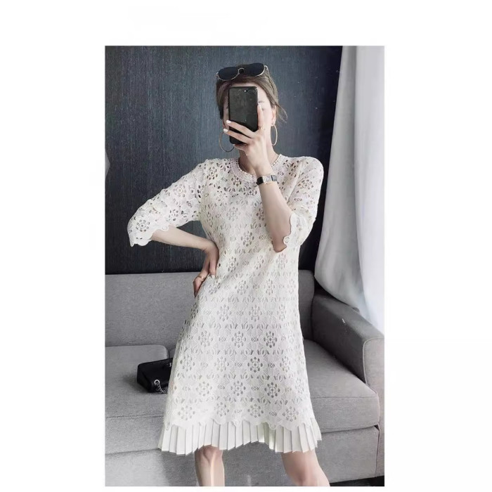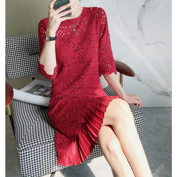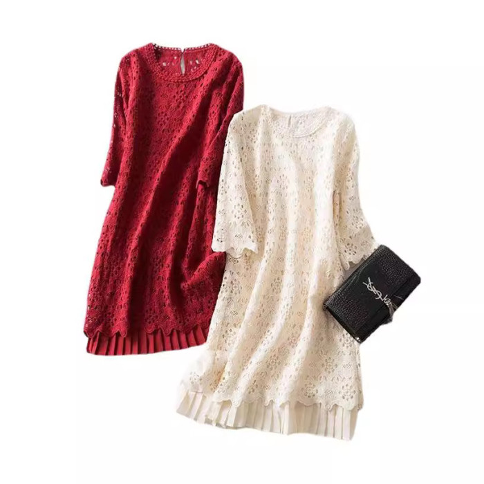 【】大碼女裝氣質春夏蕾絲連衣裙假兩件胖mm七分袖裙子7001