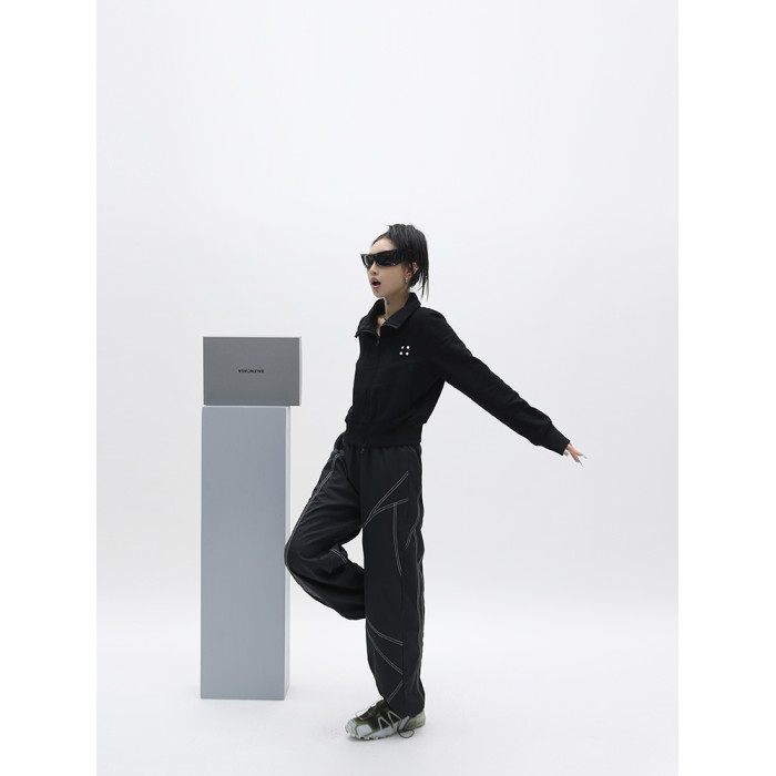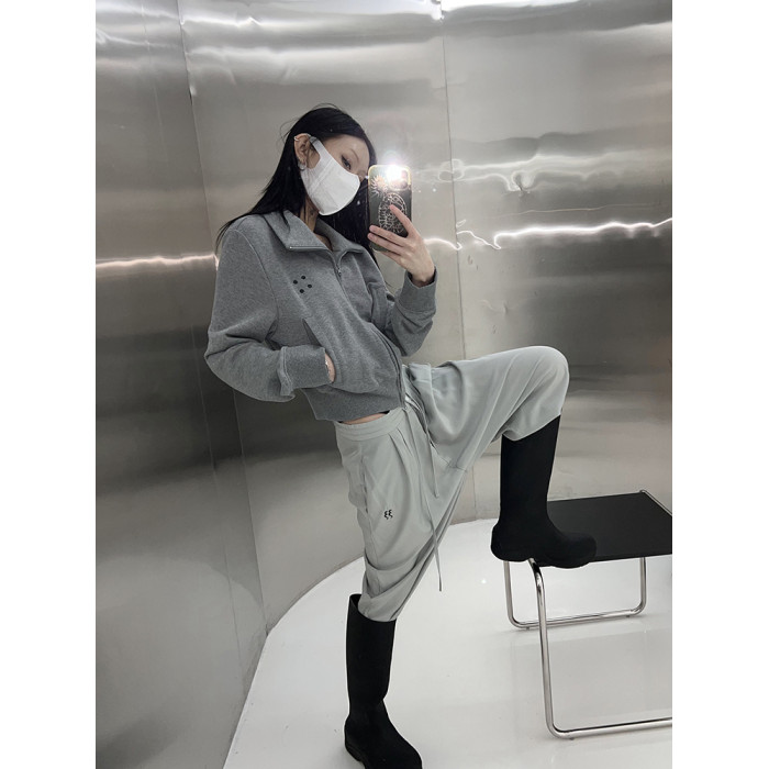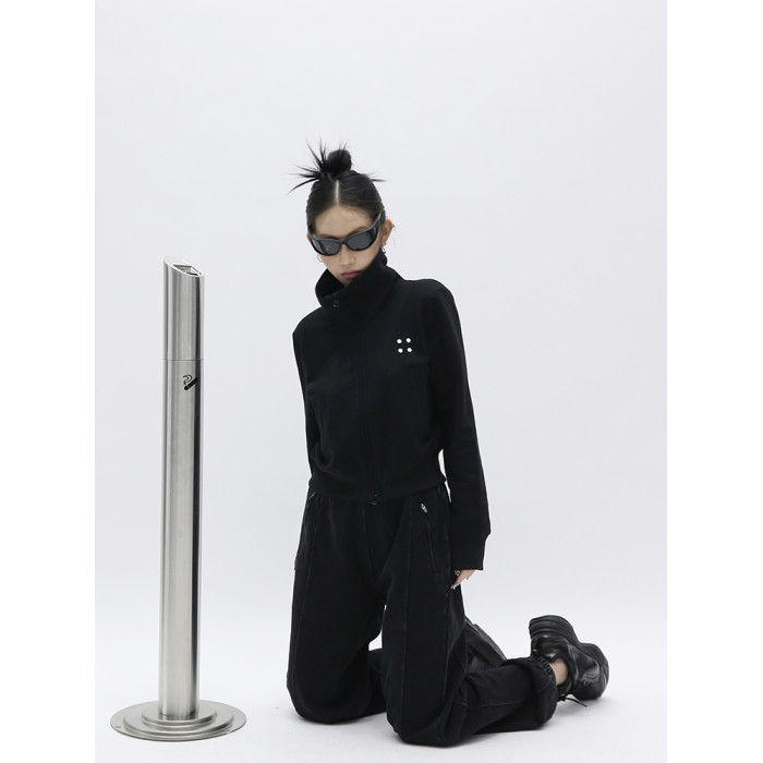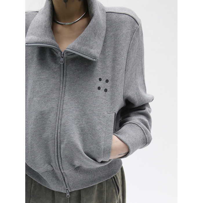 美伢FUZZYKON極簡百搭運動夾克雙拉鍊衛衣立領短外套 黑/灰