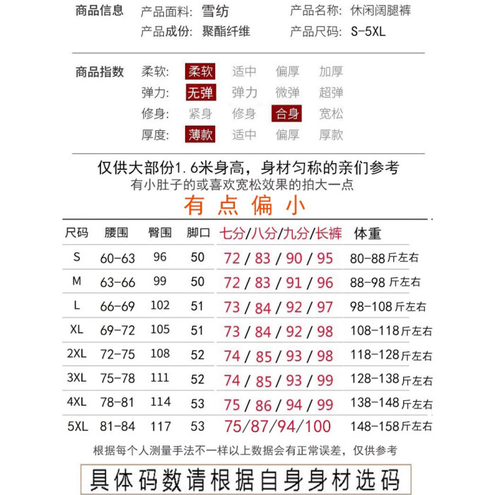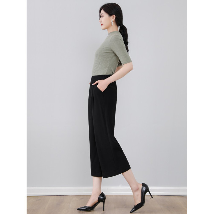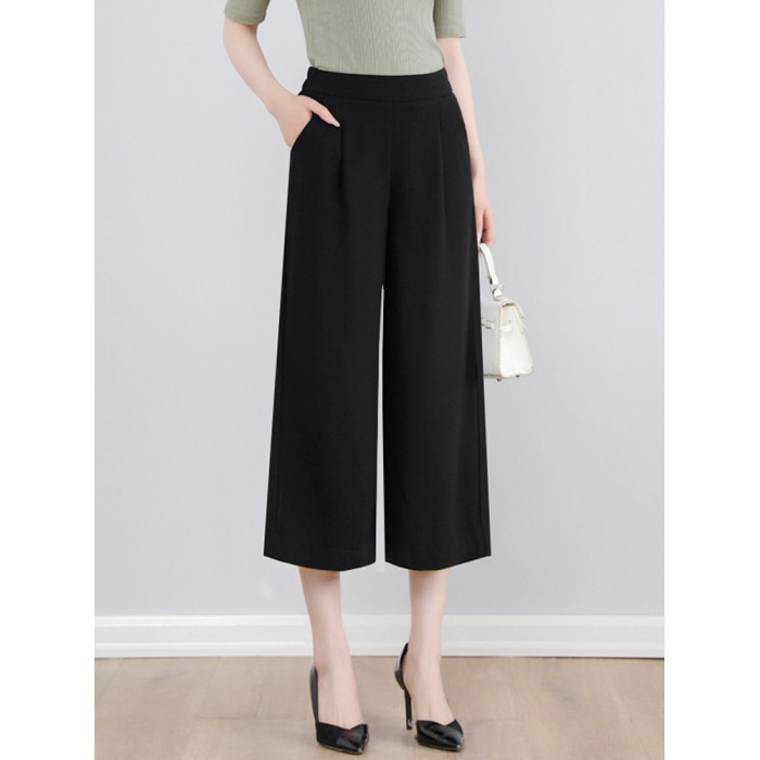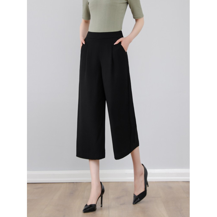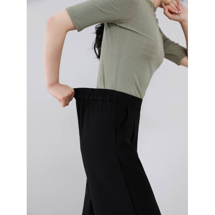 女夏新款黑色小個子八分褲垂感濶腿褲子九分雪紡通勤松緊腰休閒褲