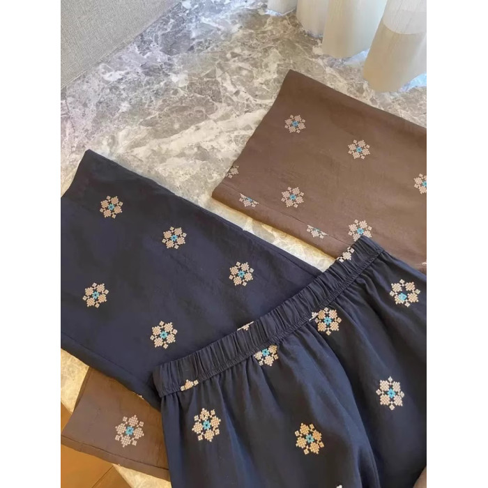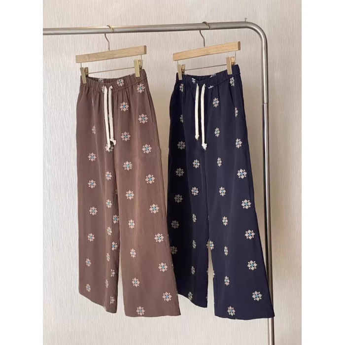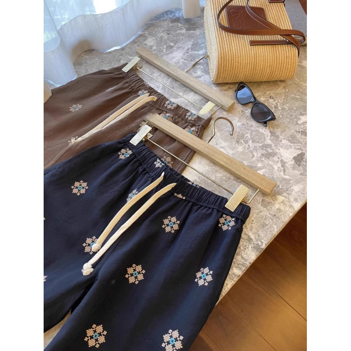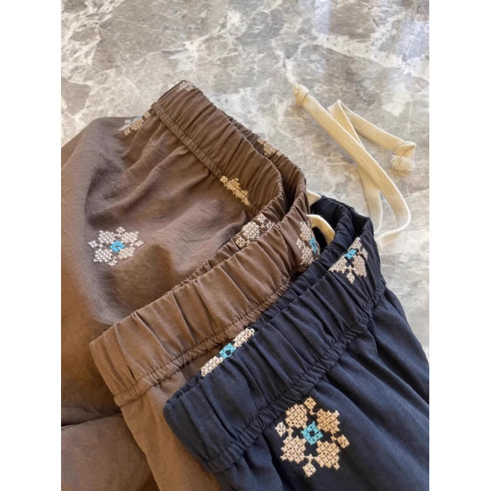 南油女裝~ 設計師款~刺綉天絲亞麻棉濶腿褲松緊腰系帶休閒褲