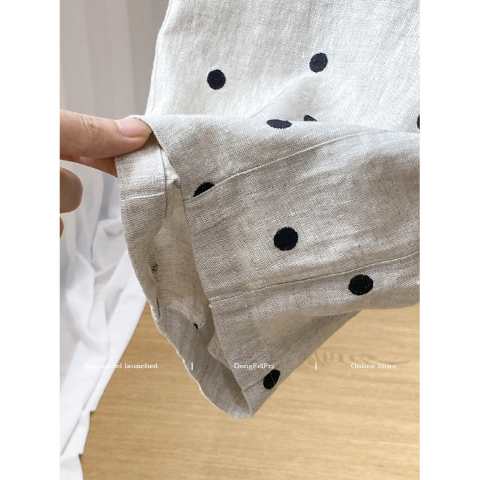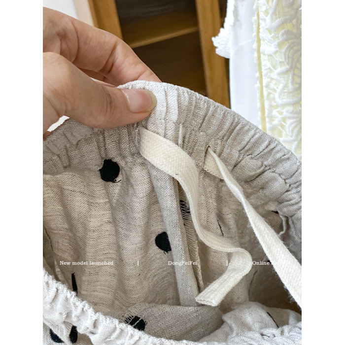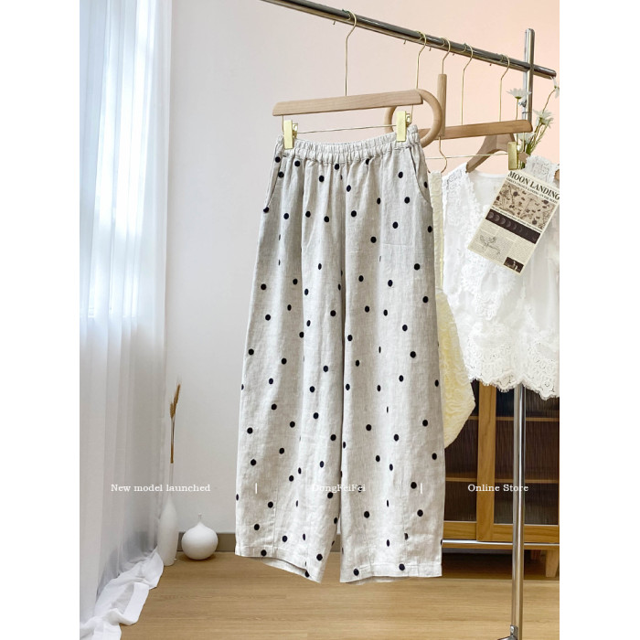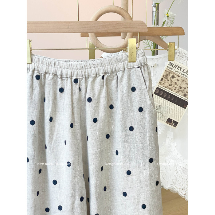 日系綉花波點亞麻濶腿褲女2025夏寬松高腰垂感抽繩休閒九分蘿蔔褲