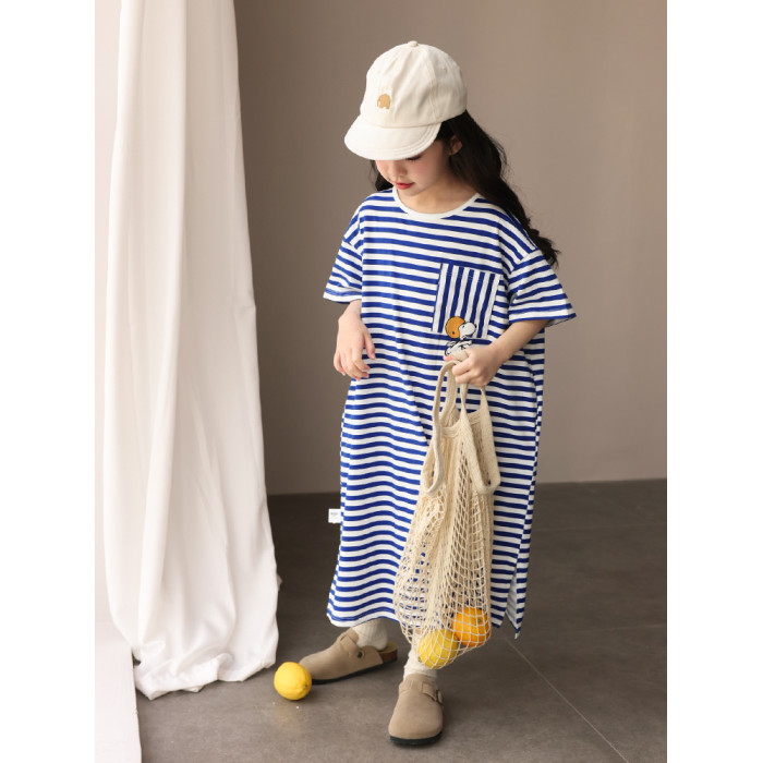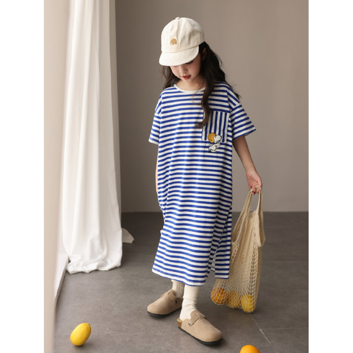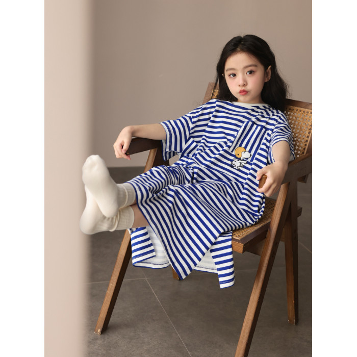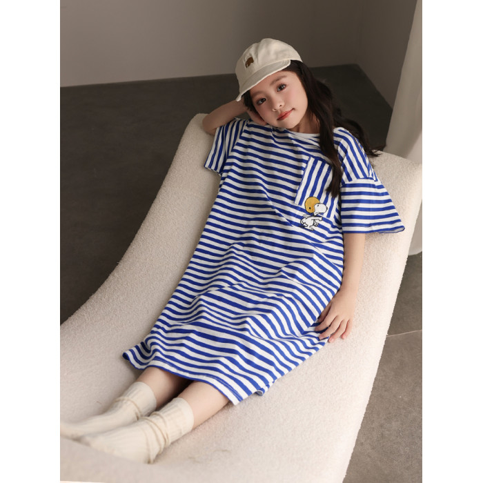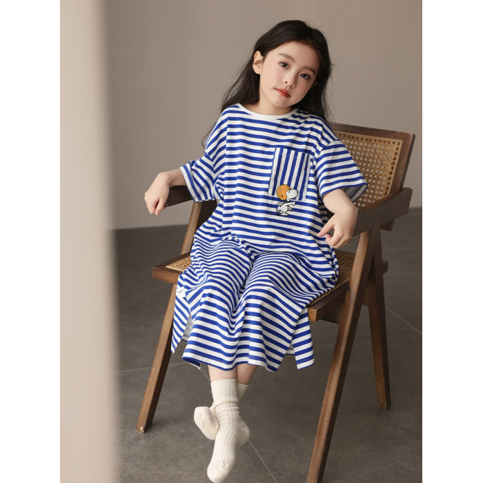 貝妍兒童睡衣夏季可愛史努比條紋親子裝柔軟棉短袖女童可外穿睡裙