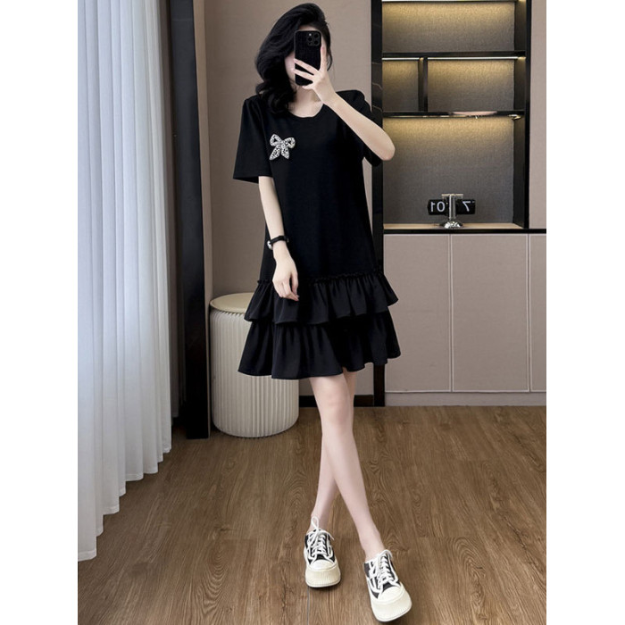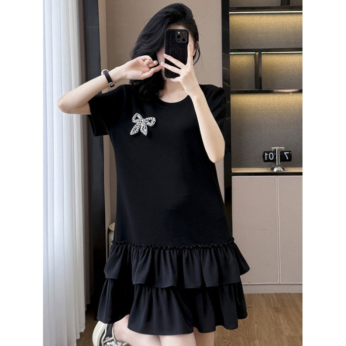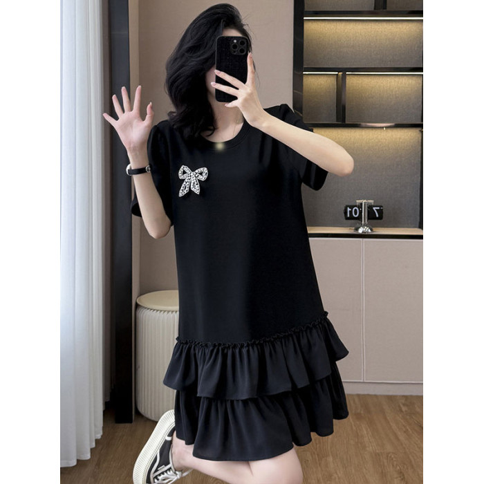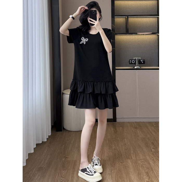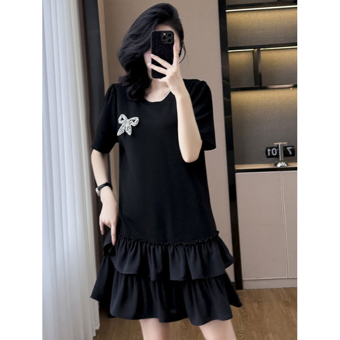 加肥加大碼洋氣荷葉邊拼接連衣裙200斤胖mm中長款遮肚上衣打底衫