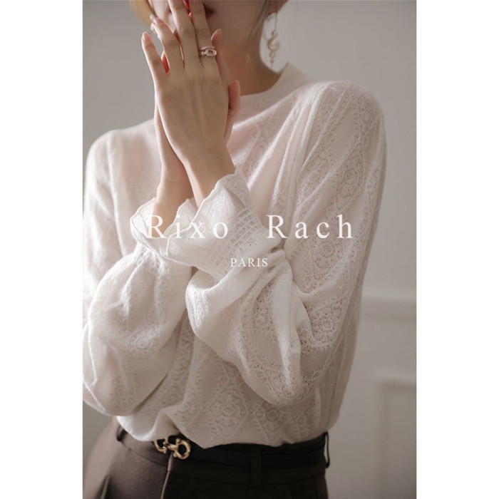 Rixo Rach新款半高領喇叭袖設計感蕾絲打底衫女針織長袖洋氣上衣