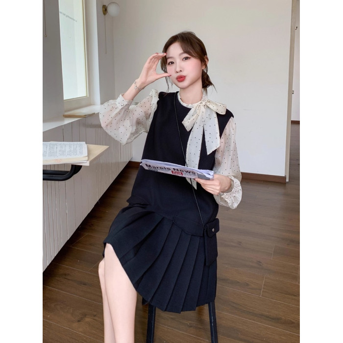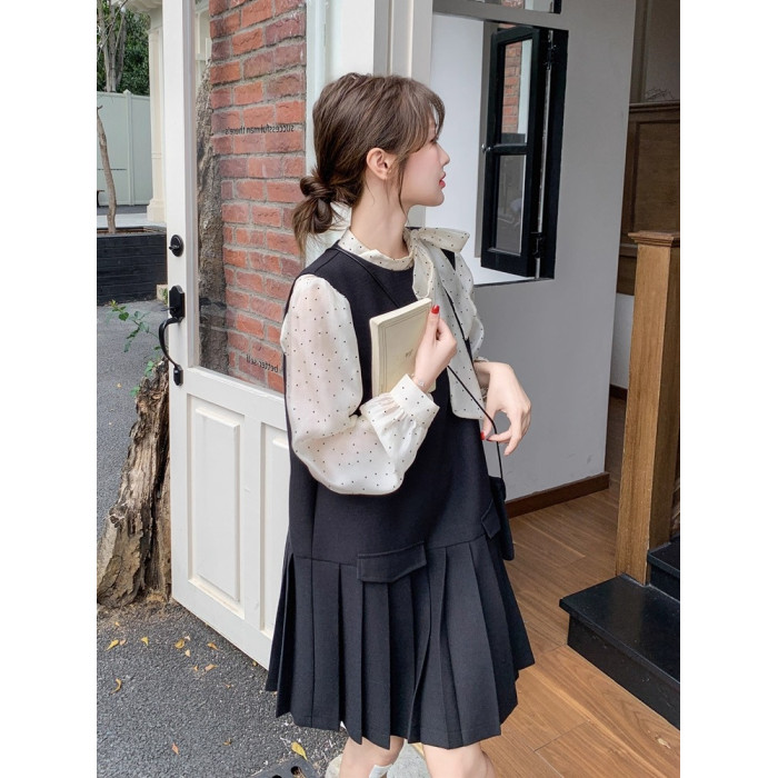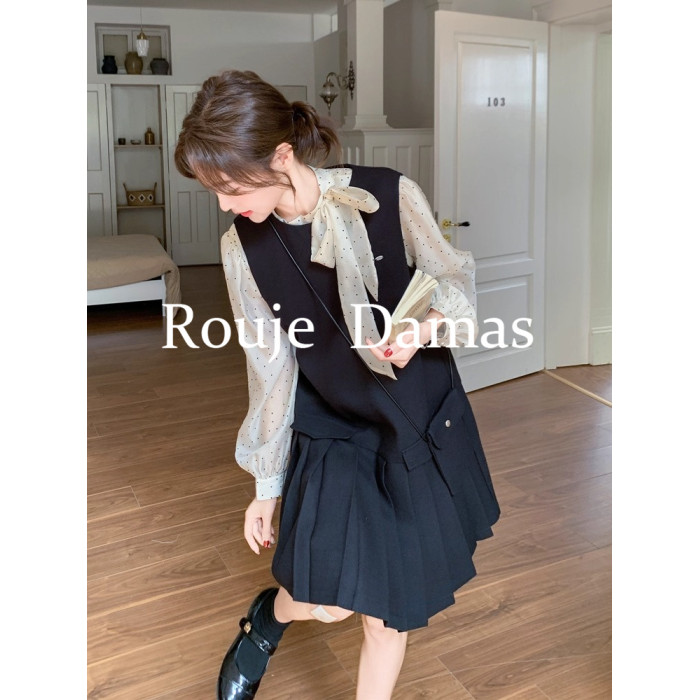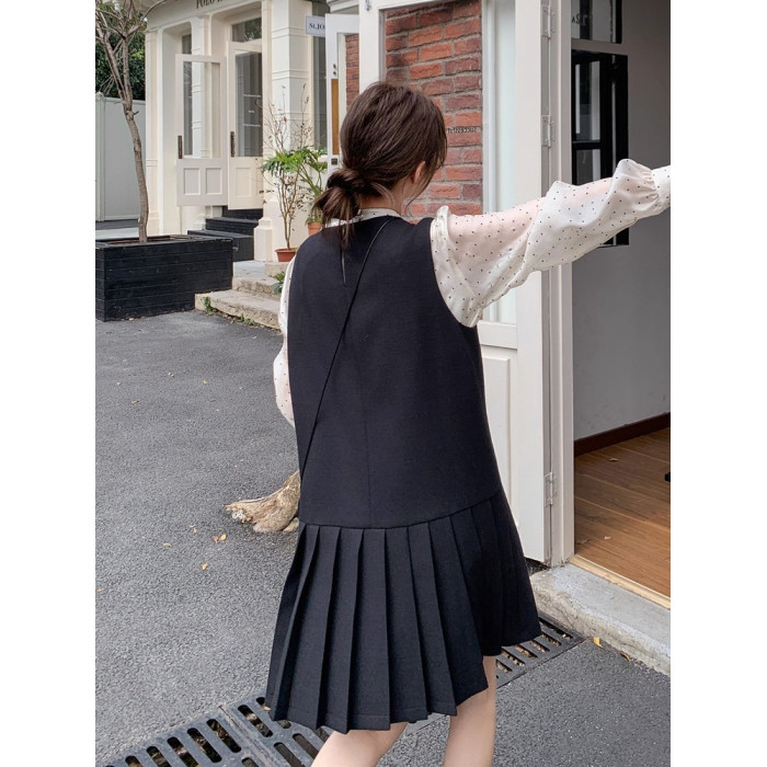 Rouje Damas 輕熟氣質波點打底衫內搭黑色百褶背心裙兩件套連衣裙