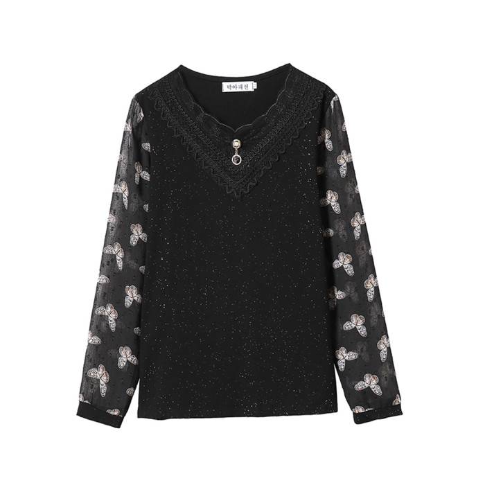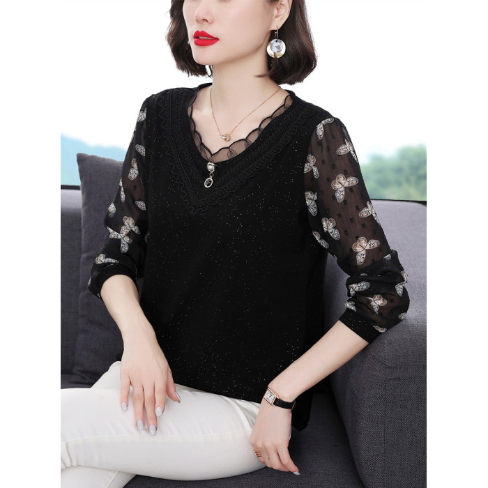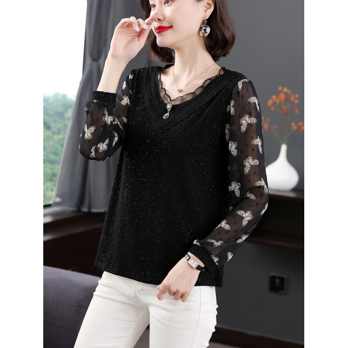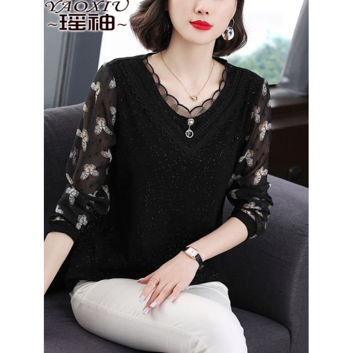大碼女裝春秋新款2025年洋氣長袖中年媽媽寬松顯瘦打底衫網紗上衣