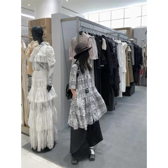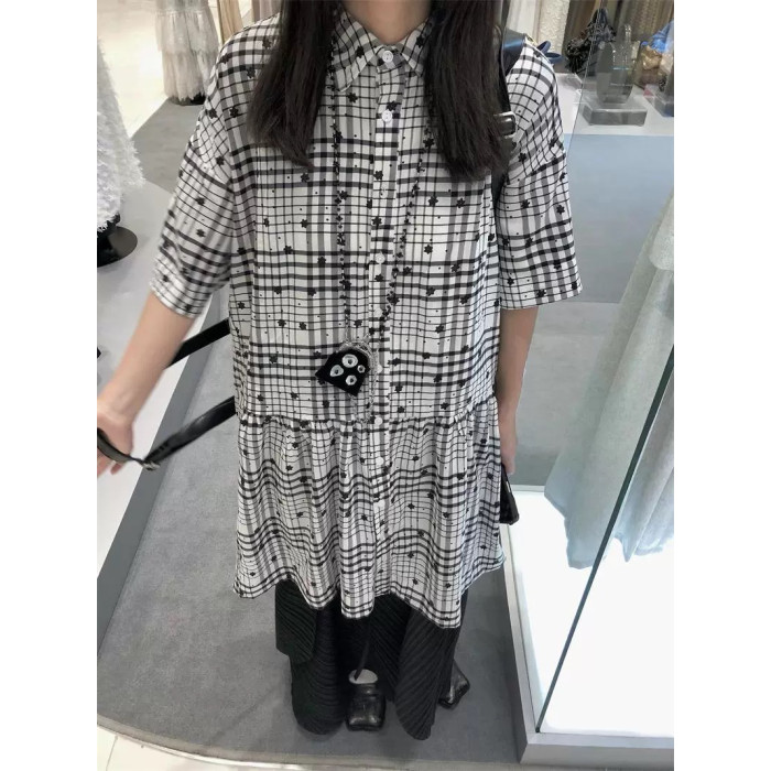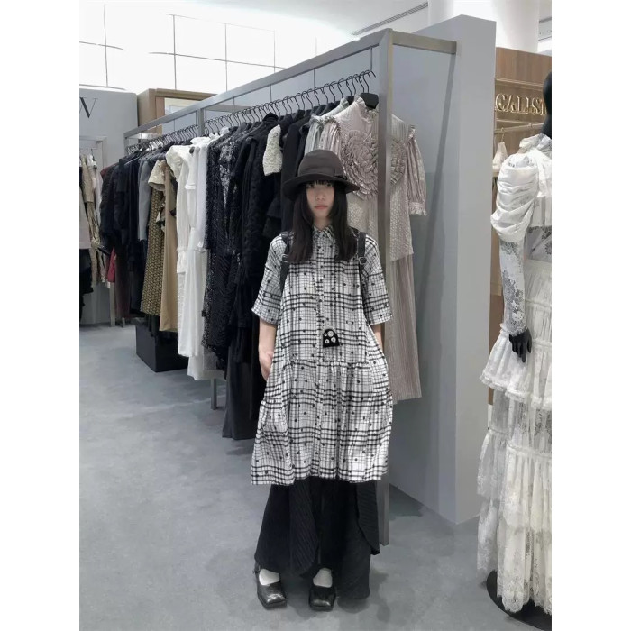 正確版花朵格子襯衫裙分割設計短袖連衣裙寬松曡穿設計感春夏