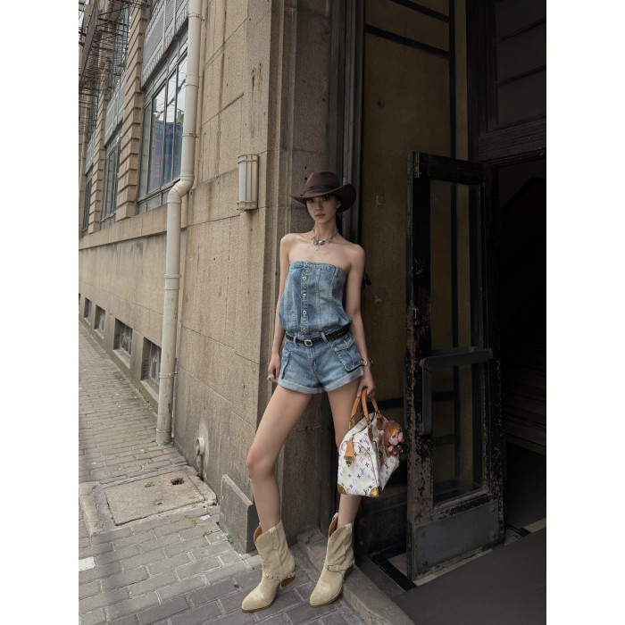 美式辣妹藍色牛仔抹胸連體衣女夏季新款性感修身連體褲連身短褲