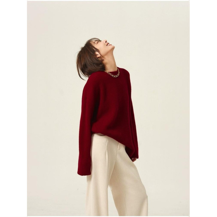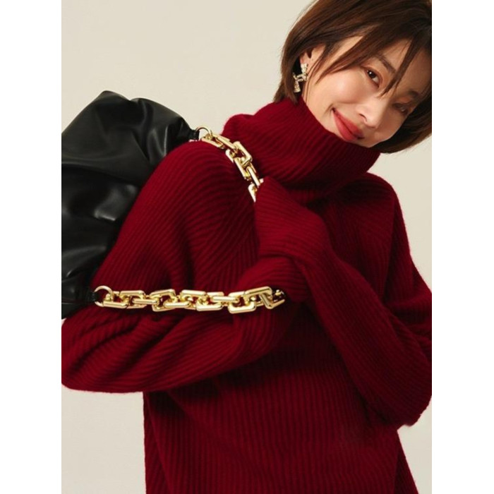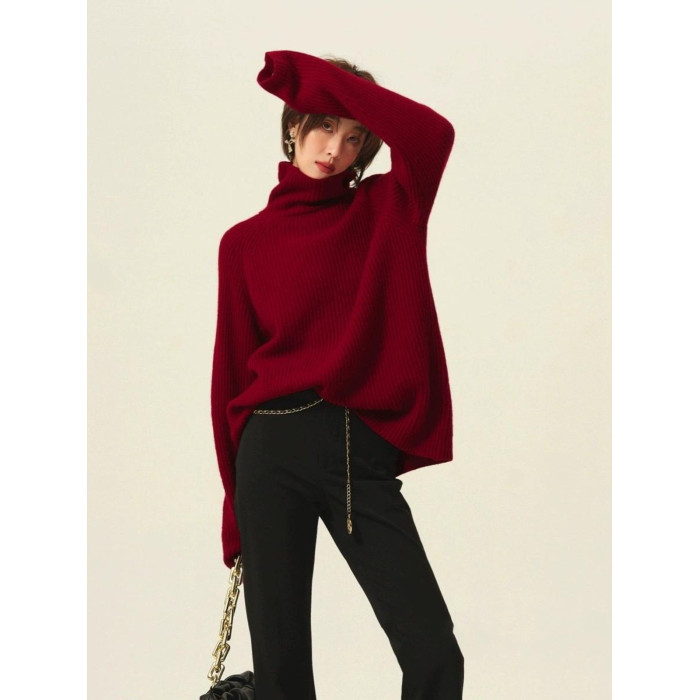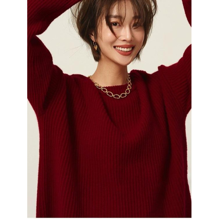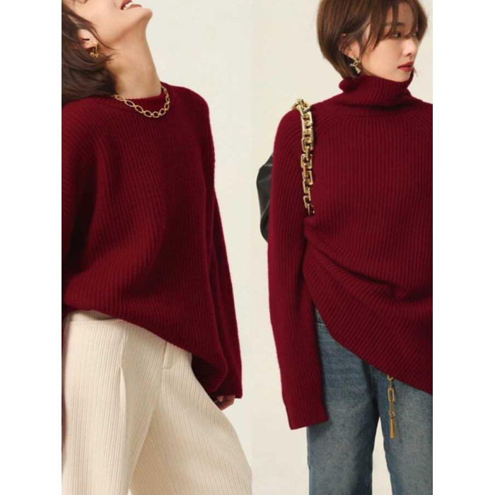 安哥拉紅色圓領針織上衣女冬季厚款高領套頭毛衣寬松慵懶風打底衫