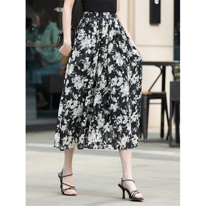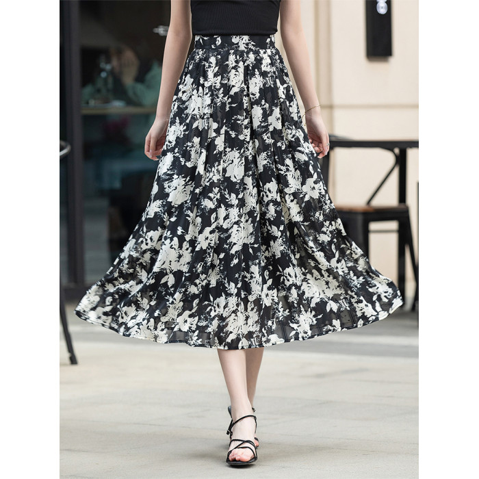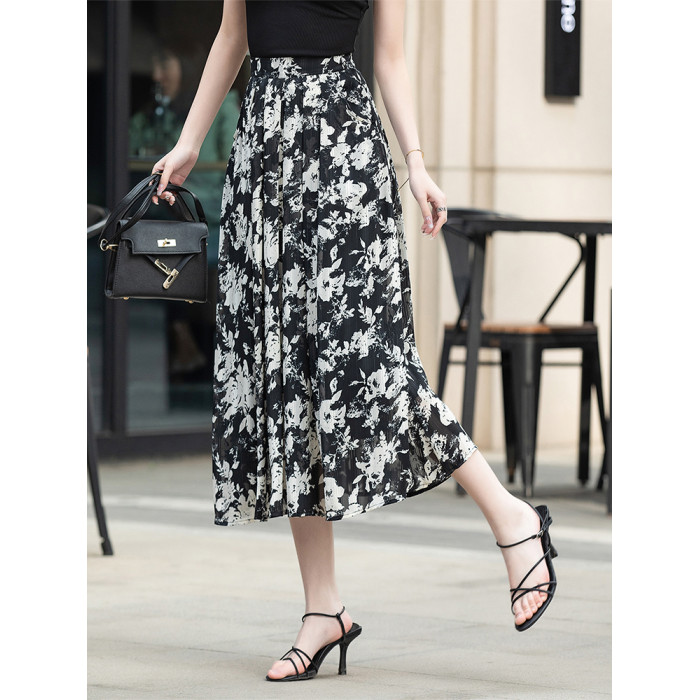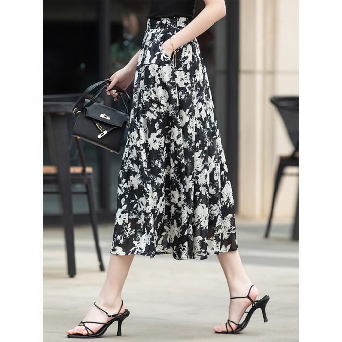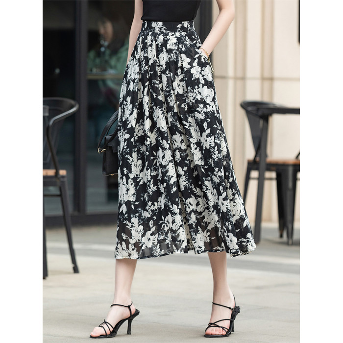 法式漂亮碎花大擺半身裙夏新款口袋高腰黑白花裙雪紡氣質百褶長裙