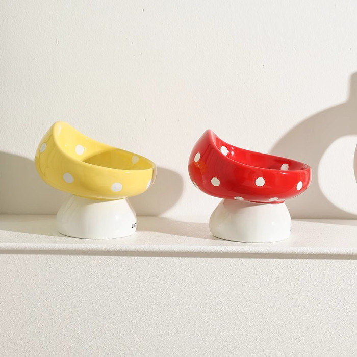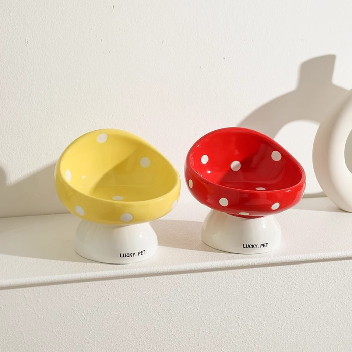 貓碗陶瓷大口徑貓碗貓食盆陶瓷斜口碗防打翻防黑下巴蘑菇高腳貓碗