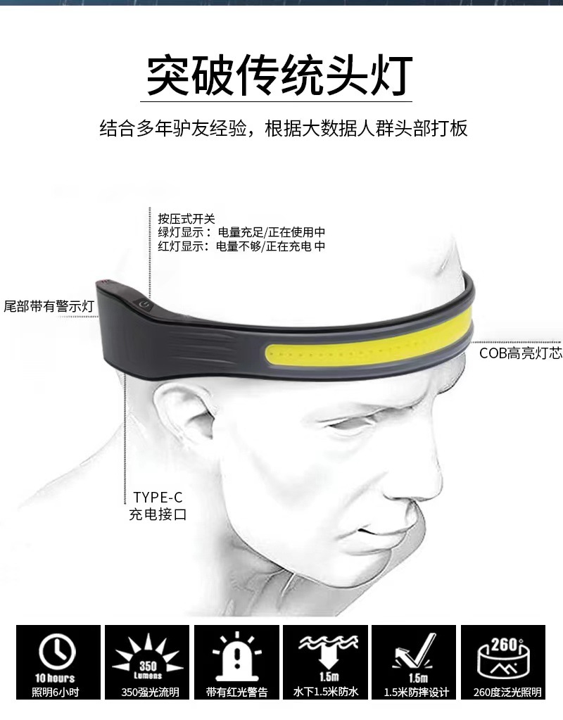 新款COB頭燈led強光頭燈戶外頭戴跑步燈輕便迷你夜釣掛脖燈野