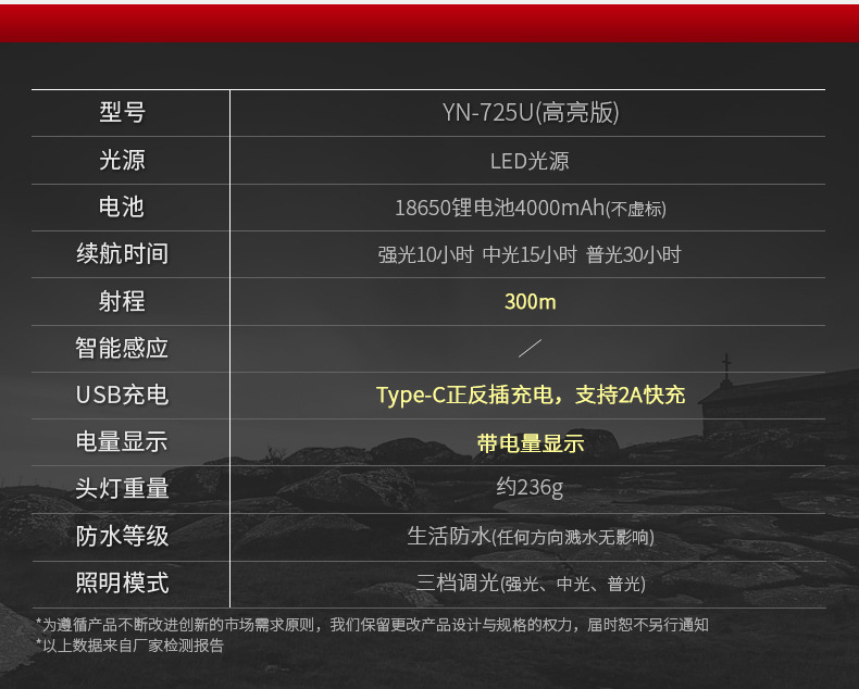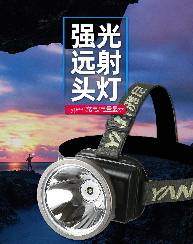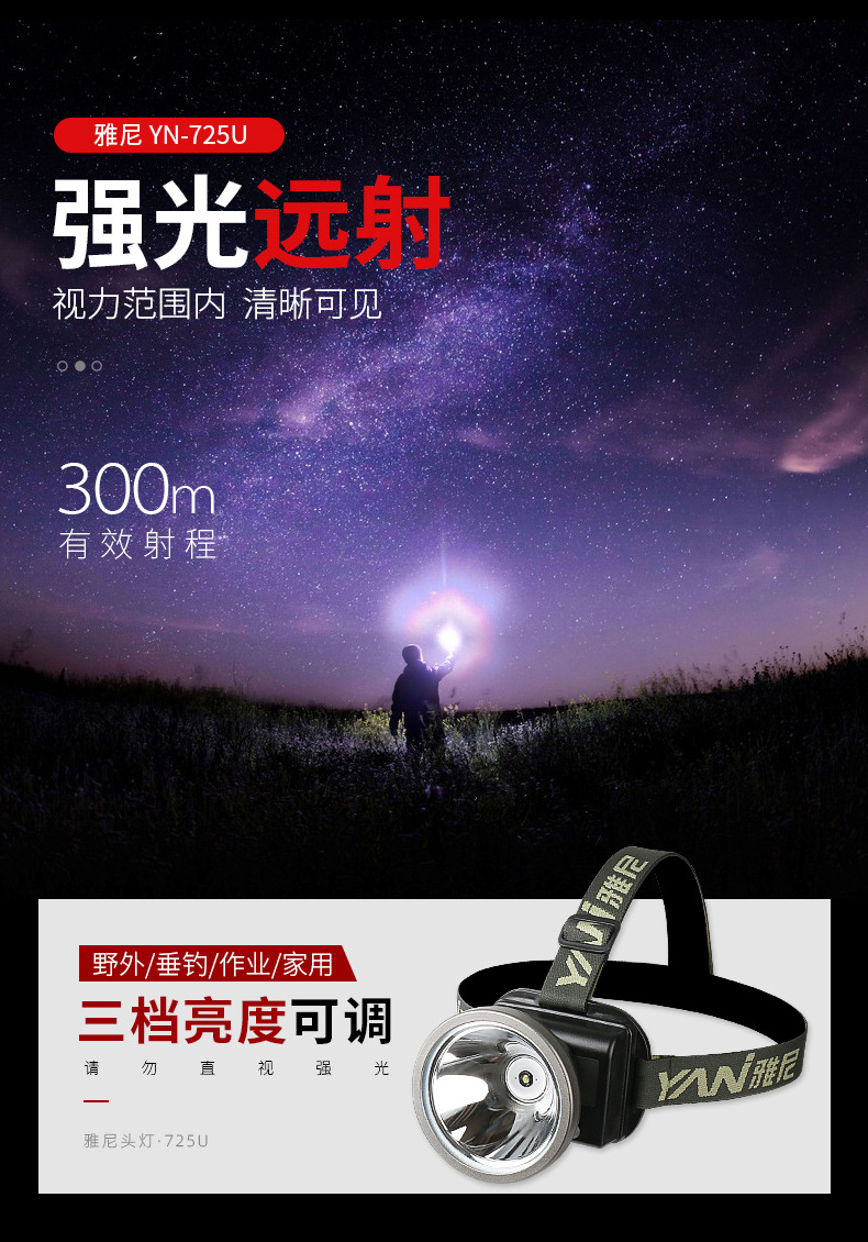 雅尼725U頭燈led強光充電超亮超長續航戶外頭戴式手電筒鋰電礦燈