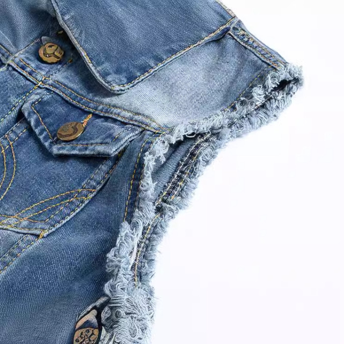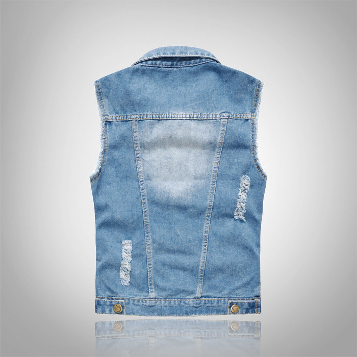 大碼韓版潮流機車男裝牛仔馬甲淺藍色馬夾坎肩破洞牛仔背心