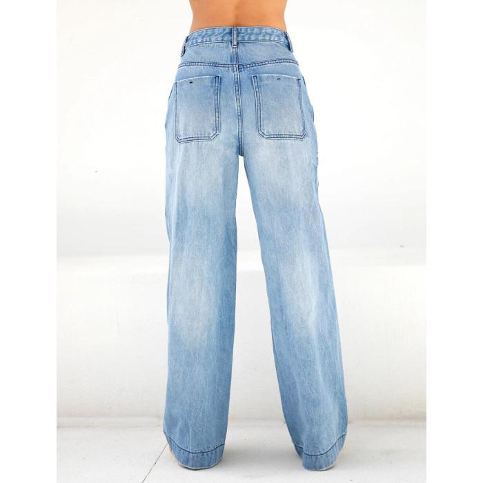 歐美2021高腰寬松濶腿女式牛仔褲拖地牛仔褲新款
