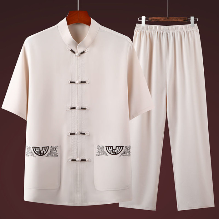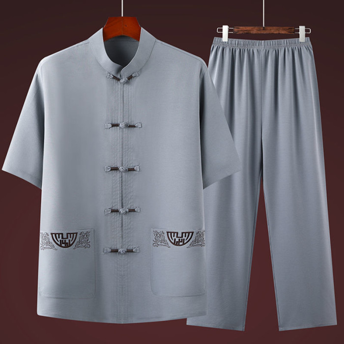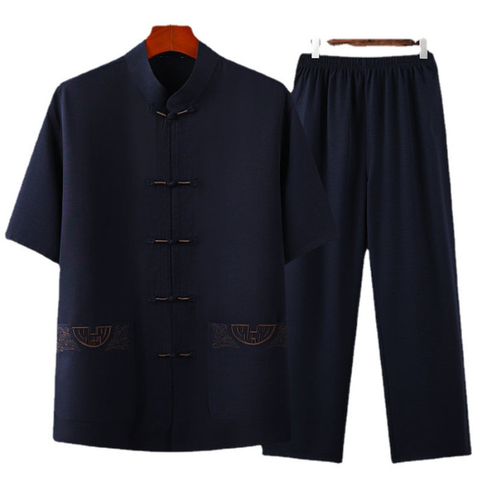 夏季唐裝男中老年短袖爸爸休閒套裝風棉麻太極服爺爺寬松衣服