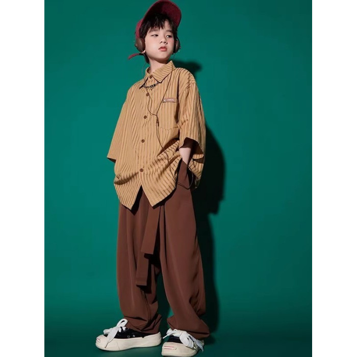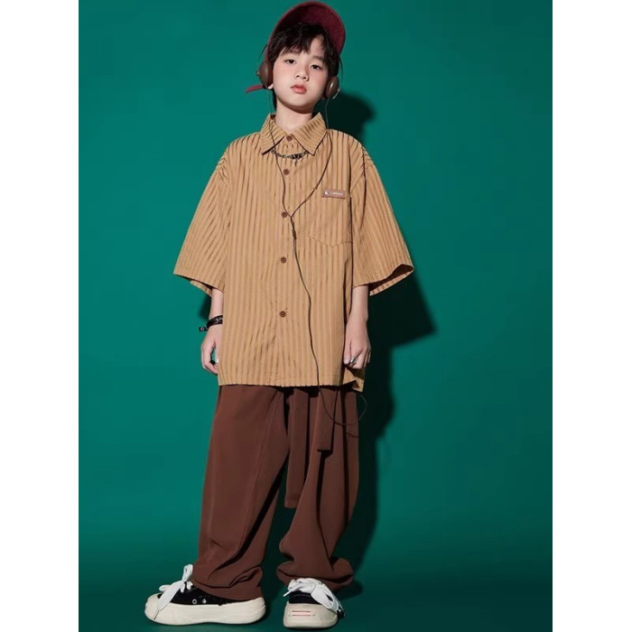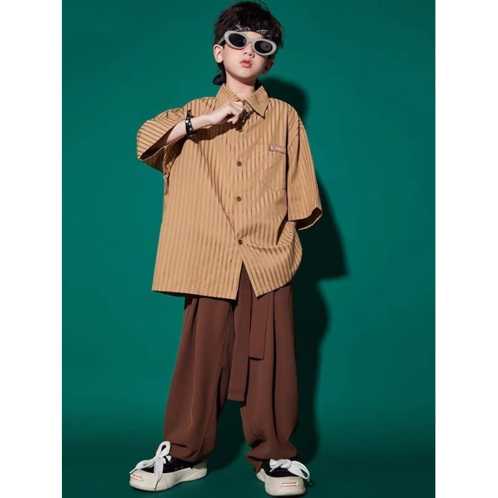 咖色條紋上衣+棕色西褲