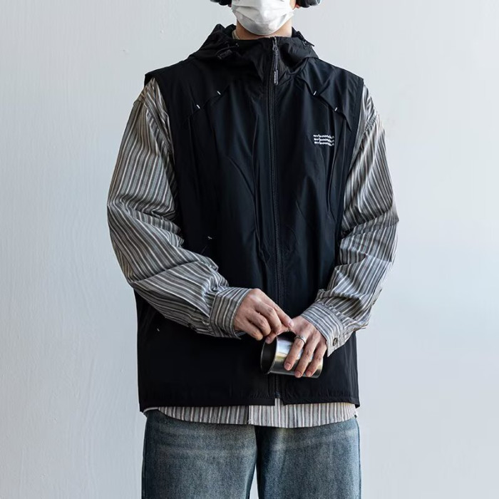 日系山系連帽立領工裝馬甲男女同款戶外徒步休閒寬松百搭坎肩外套