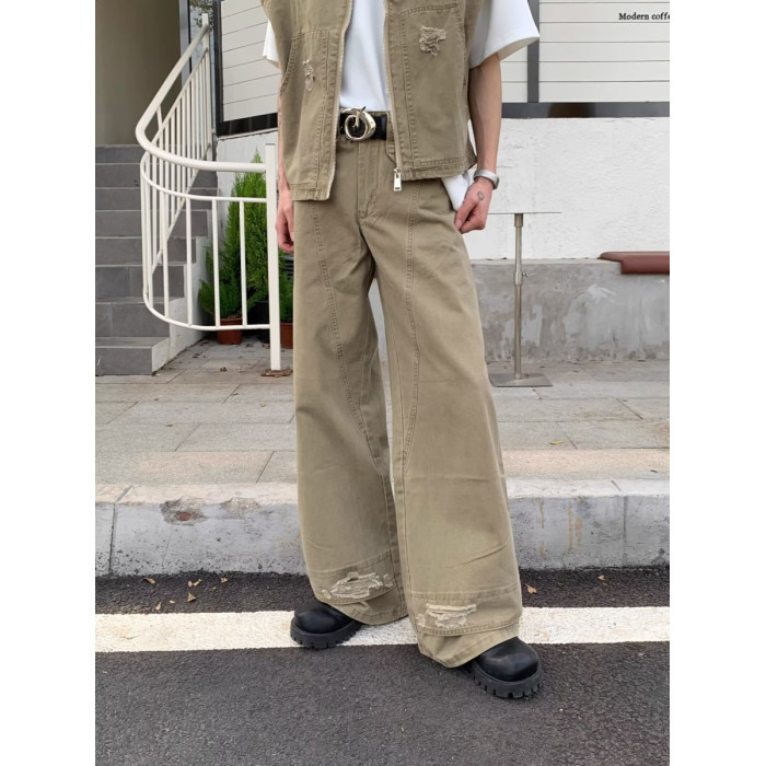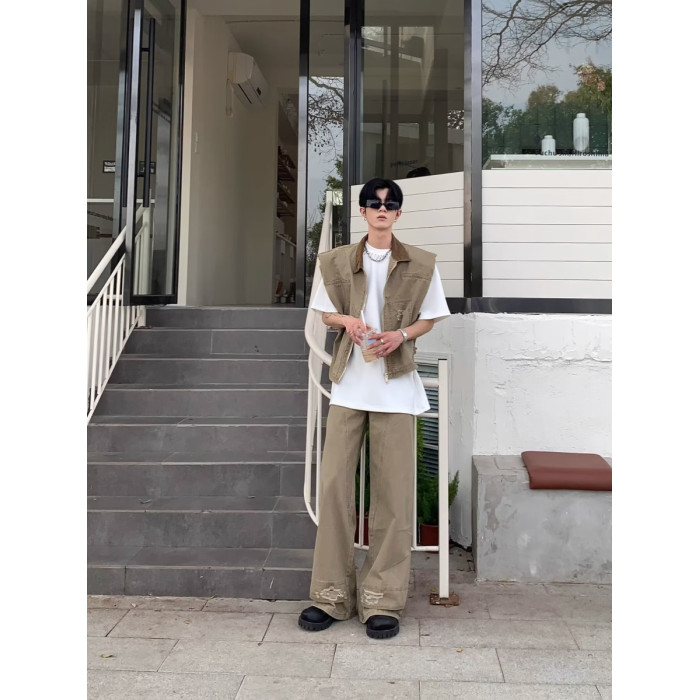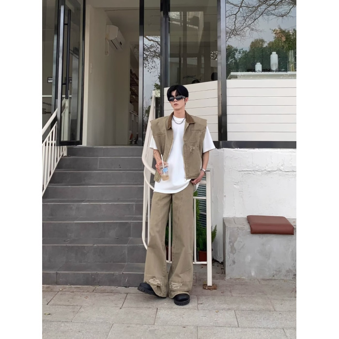 美式復古做舊廓形設計坎肩無袖墊肩工裝馬甲男女潮牌破壞風工裝褲