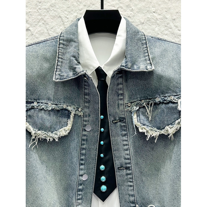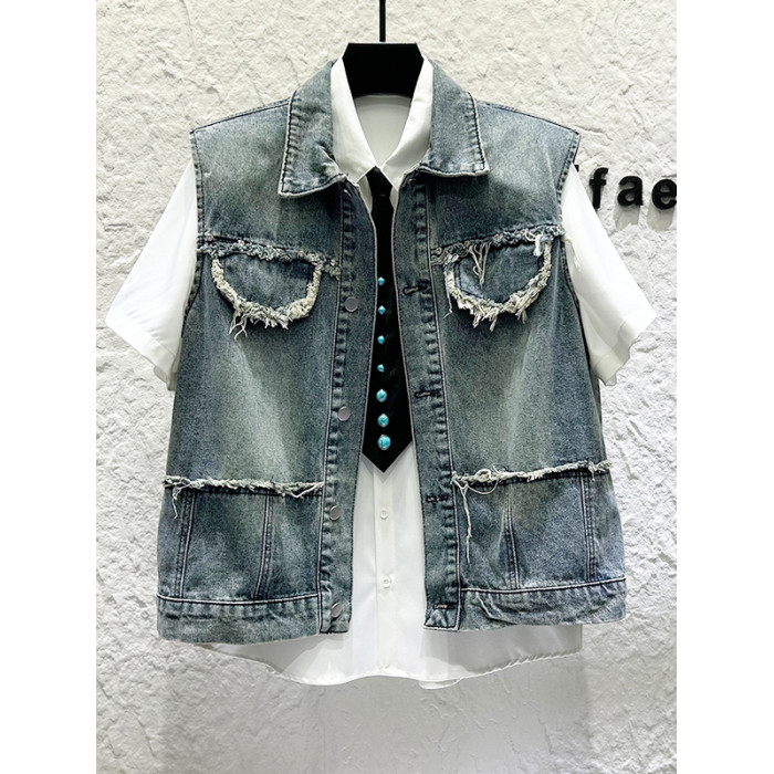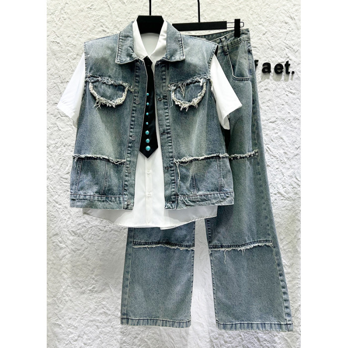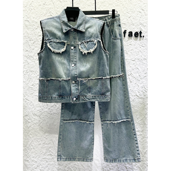 美式復古水洗做舊牛仔褲子馬甲兩件套裝男工裝潮牌痞炸街無袖夾克