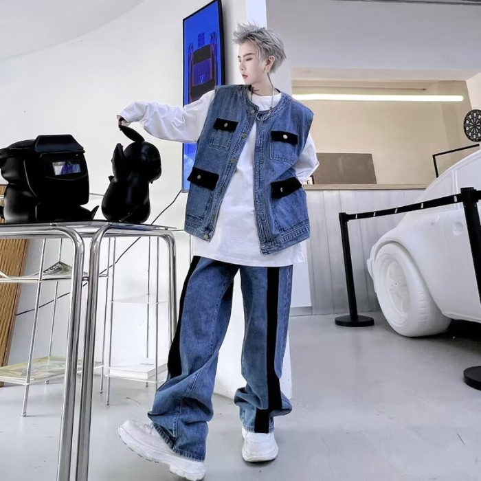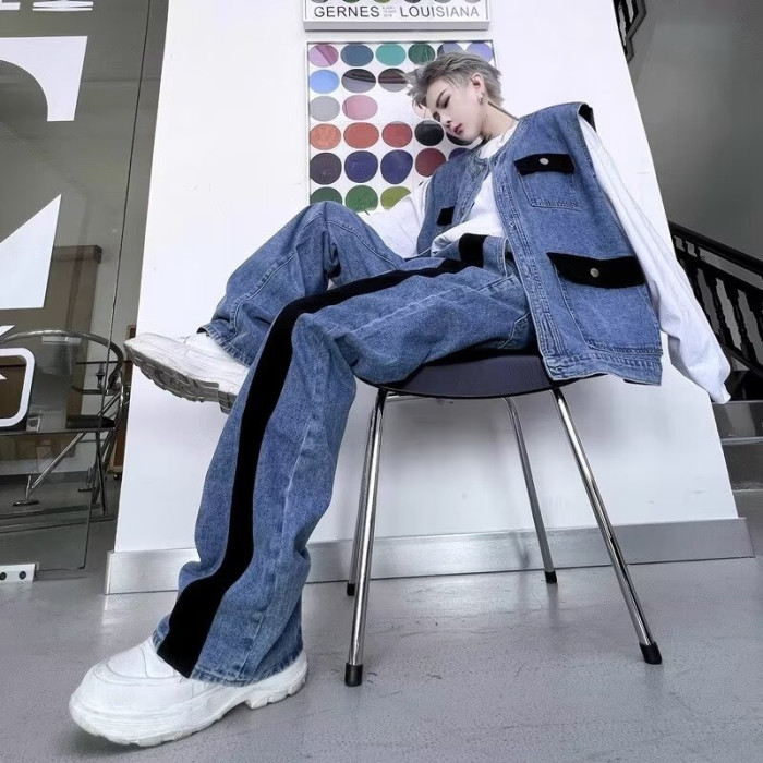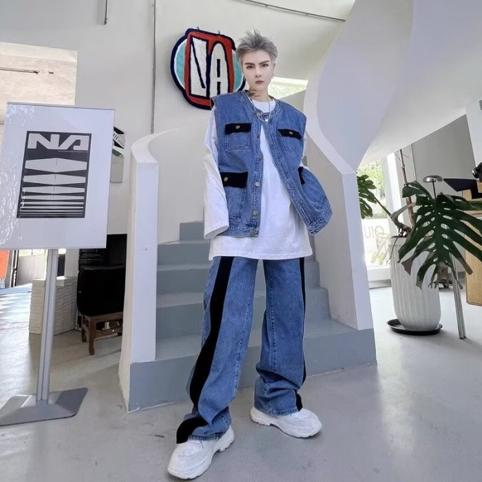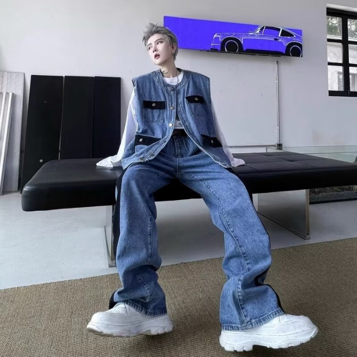 撞色設計感牛仔馬甲外套濶腿直筒長褲痞帥炸街頭搭配套裝男高級感