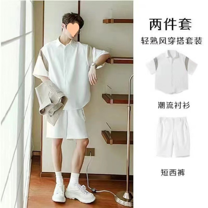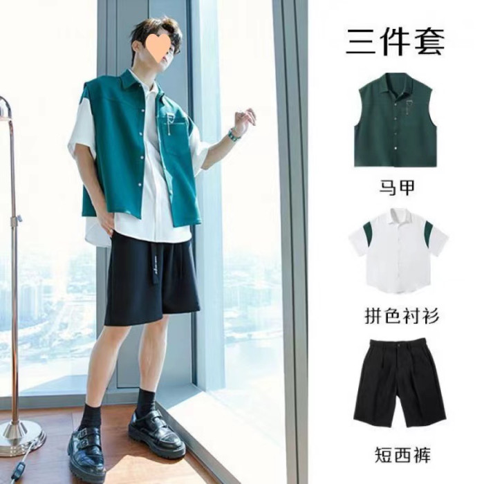 小紅書男生穿搭夏季日系復古馬甲套裝男士輕熟風短袖工裝襯衫外套