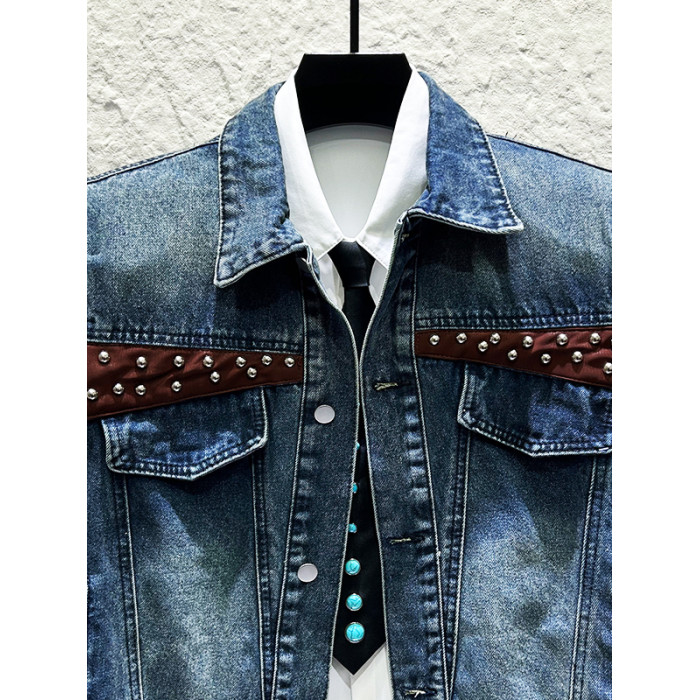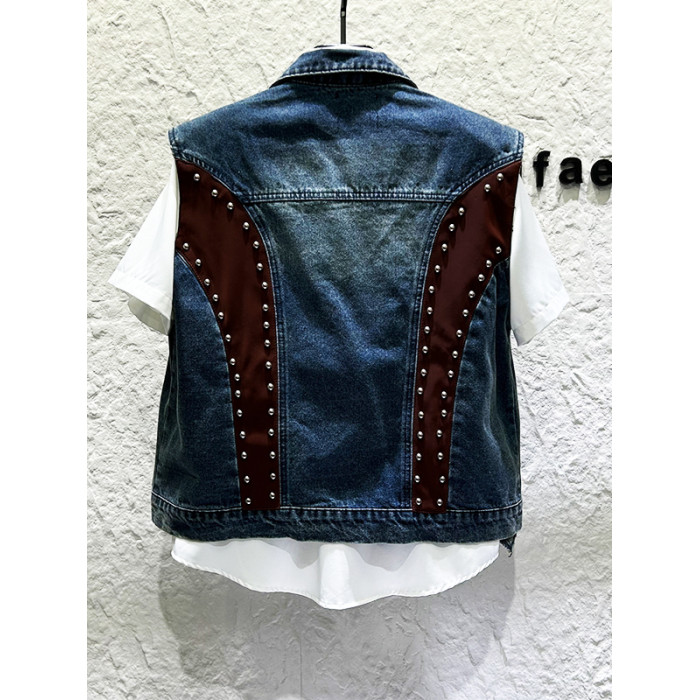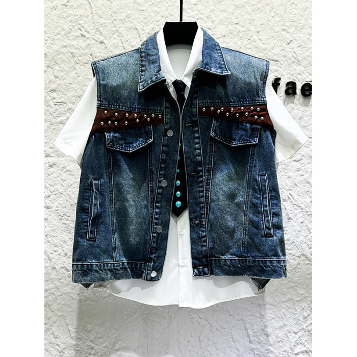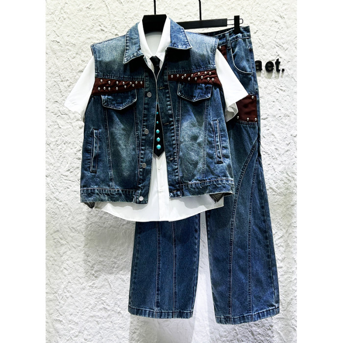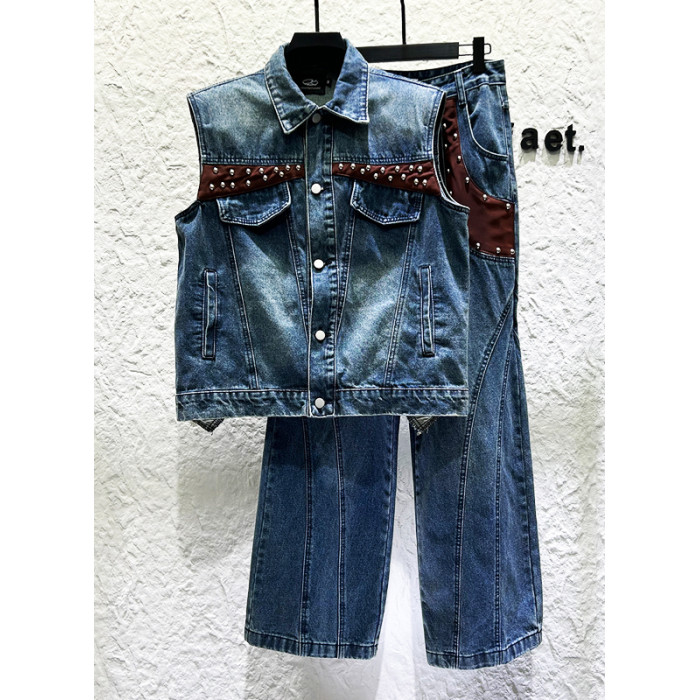 新款個性鉚釘設計撞色牛仔時尚套裝男潮牌復古寬松無袖馬甲牛仔褲