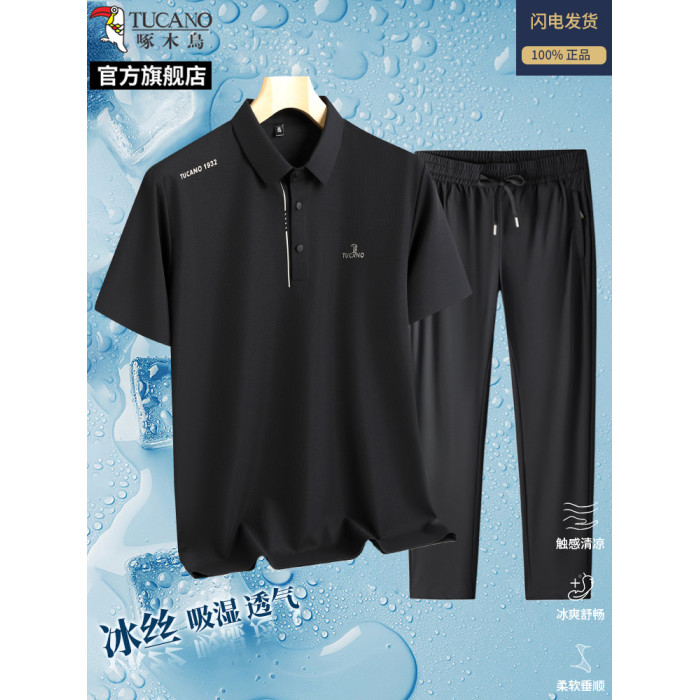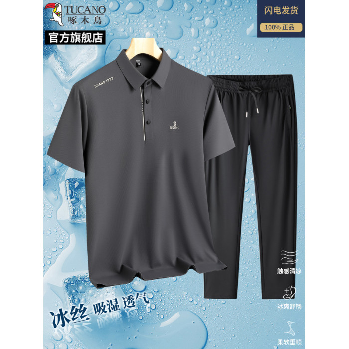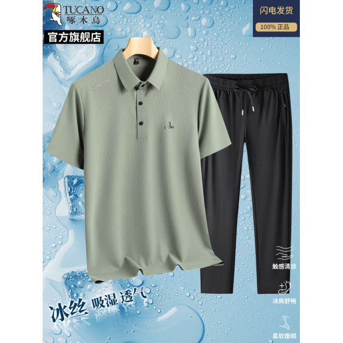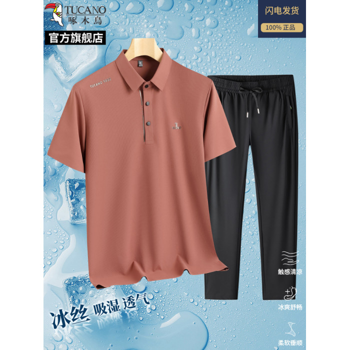 啄木鳥官方2025新款冰絲爸爸夏套裝透氣舒適短袖t恤運動中老年