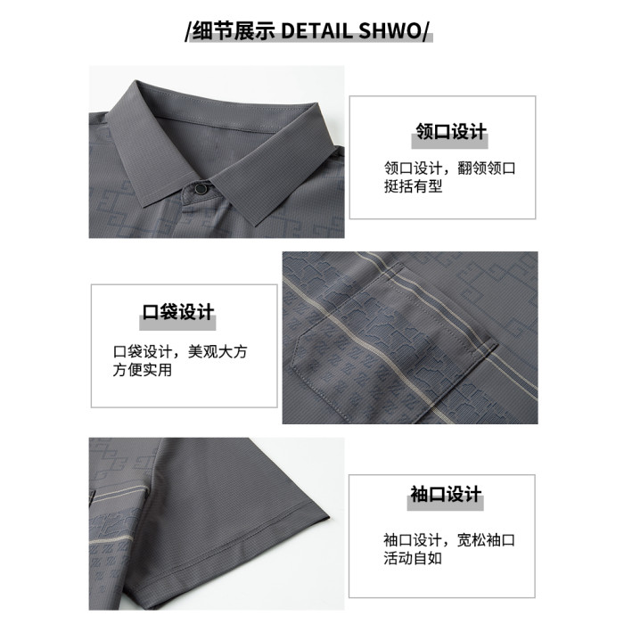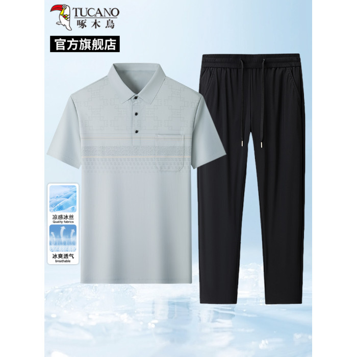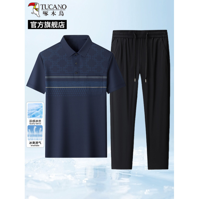 啄木鳥官方夏季2025新款兩件套爸爸冰絲運動套裝男士休閒polo衫C