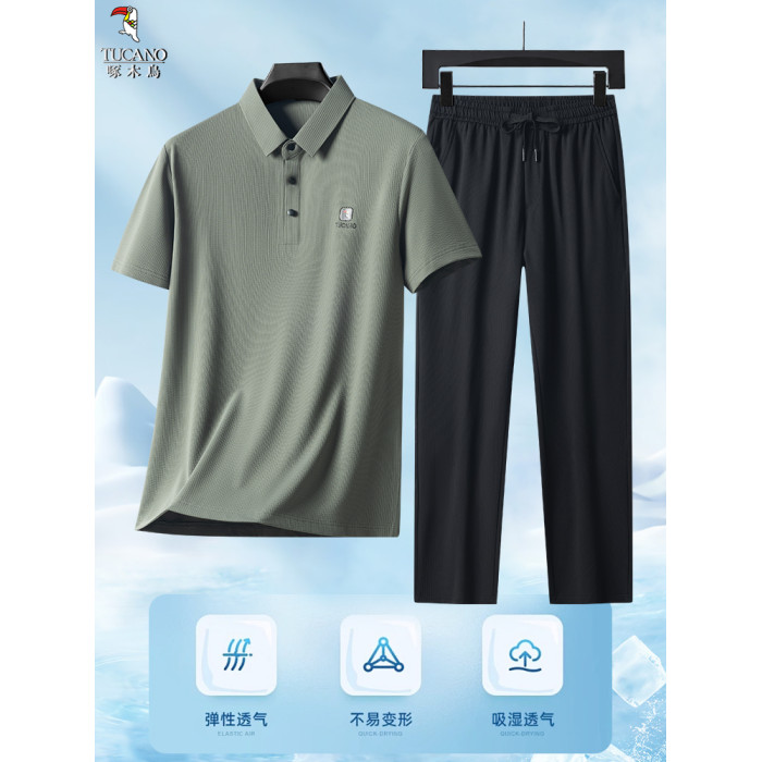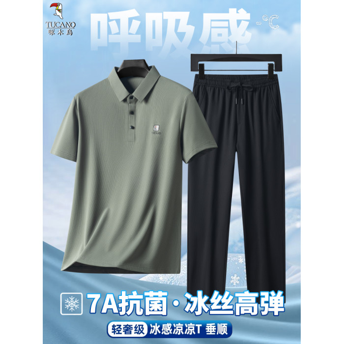 啄木鳥官方旗艦店爸爸夏套裝2025新款中年短袖t恤冰絲POLO衫套裝