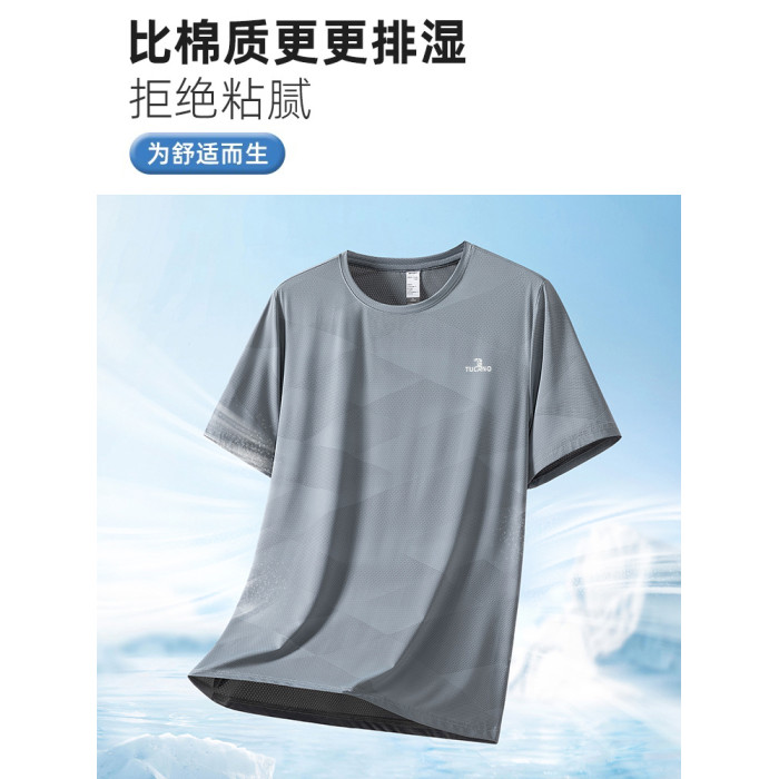 啄木鳥冰絲休閒套裝男士夏季薄款寬松速乾彈力中年短袖T恤兩件套K