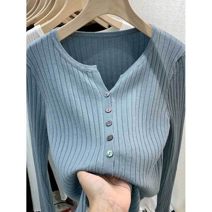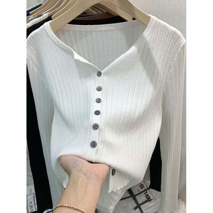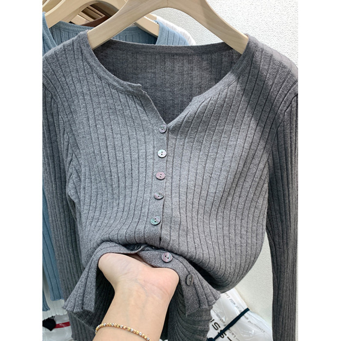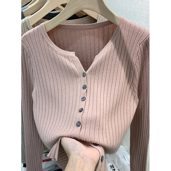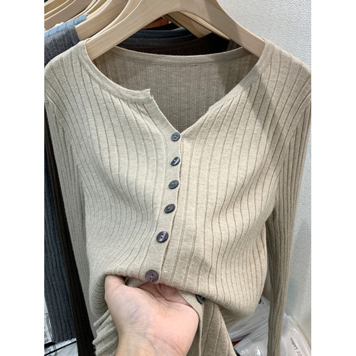 日系卡其色針織衫女春秋薄款V領開衫針織外套修身休閒打底衫上衣