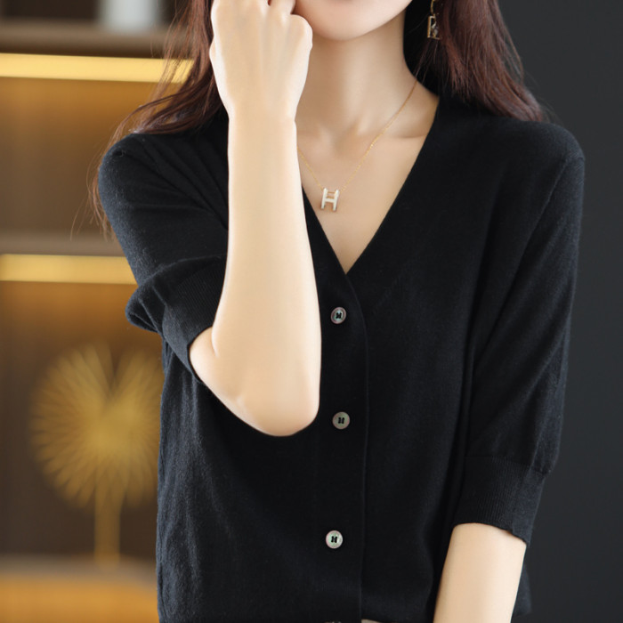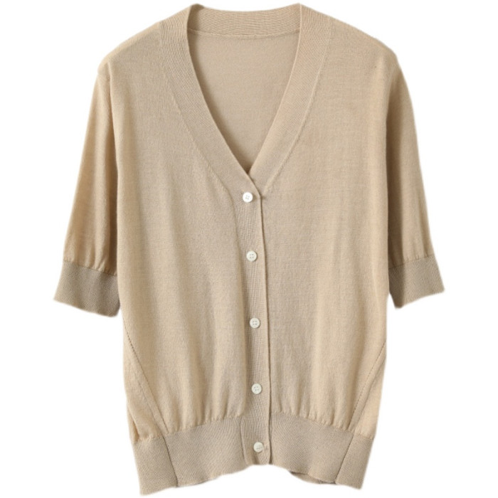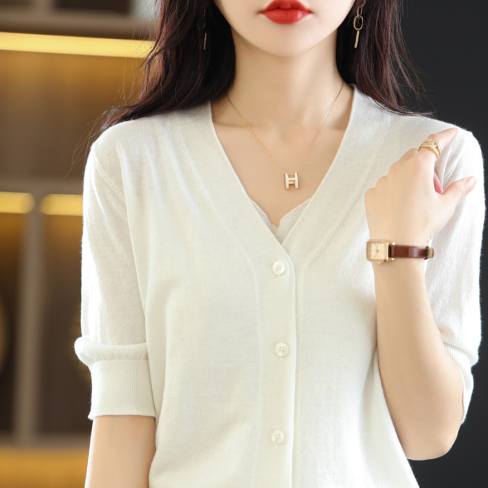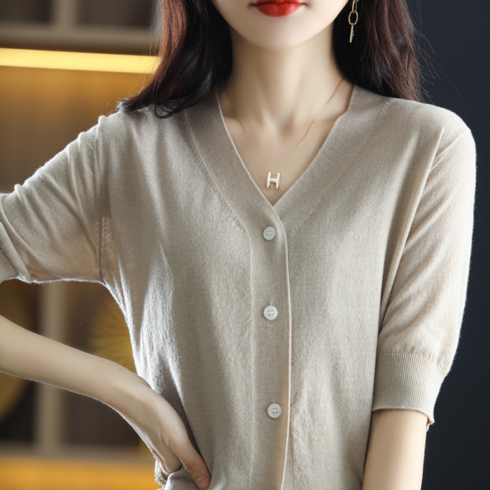 2025新款夏季羊毛針織開衫女短袖外套v領打底衫寬松上衣外搭薄款