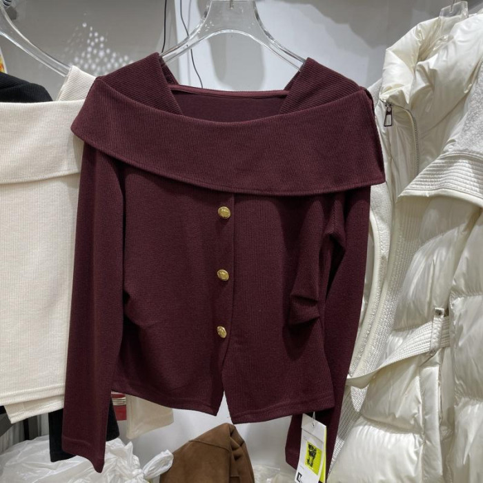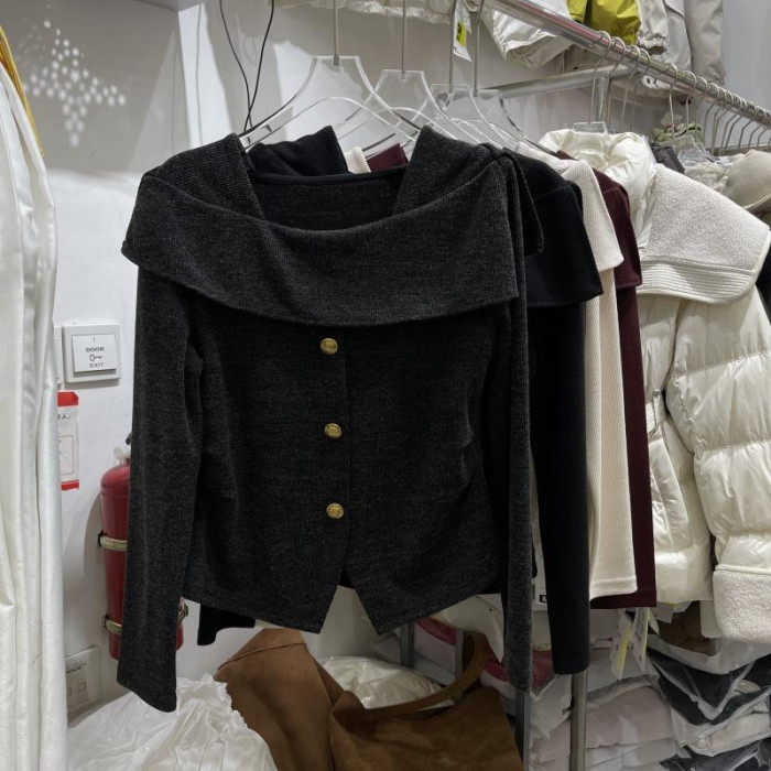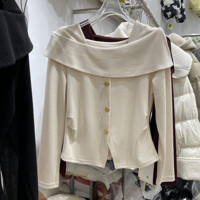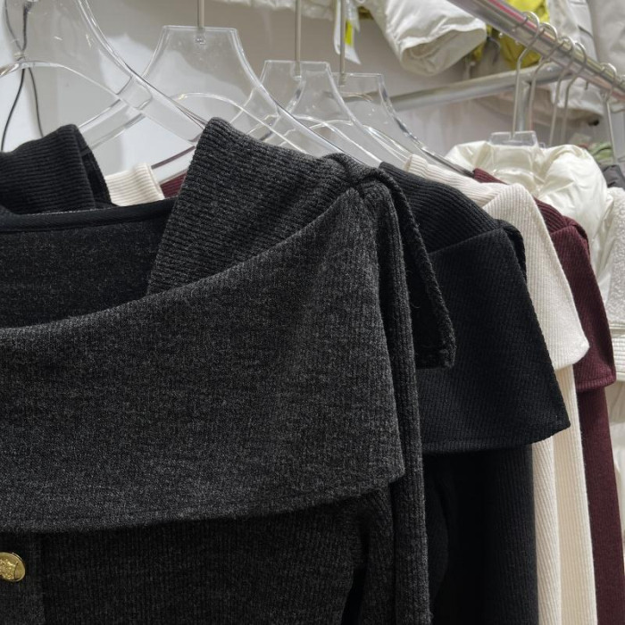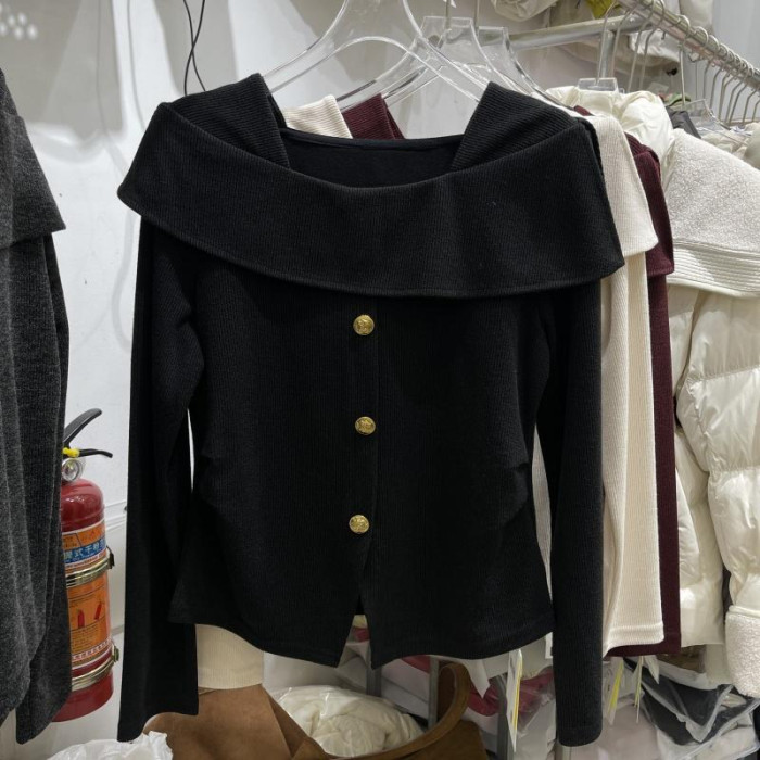 晶晶家2025秋季新款針織衫女裝時尚設計感一字肩翻領打底衫上衣女