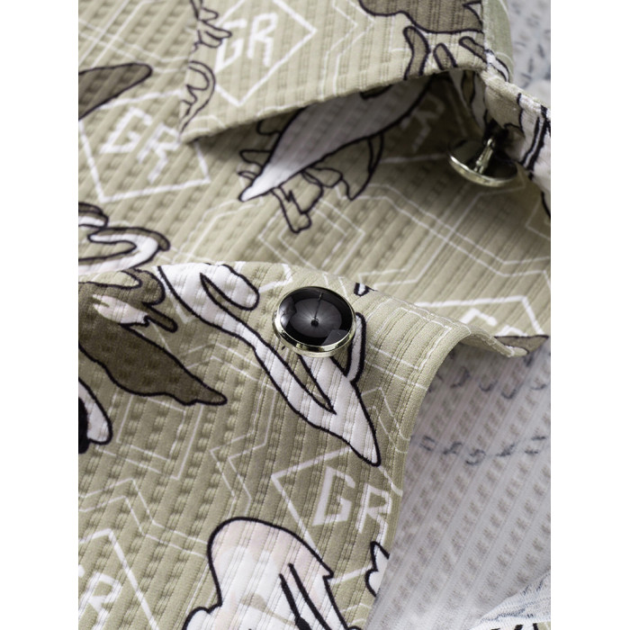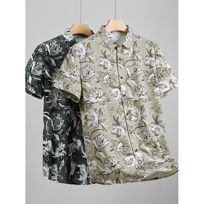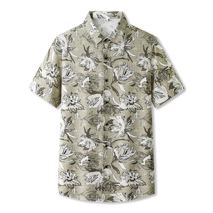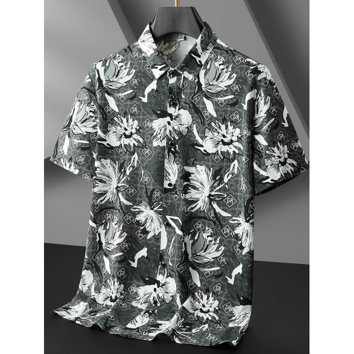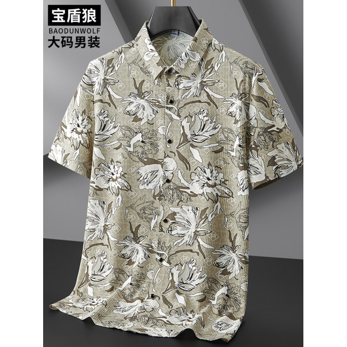 冰絲涼感半袖襯衣男夏季加肥大碼碎花打底衫肥佬寬松彈力短袖襯衫